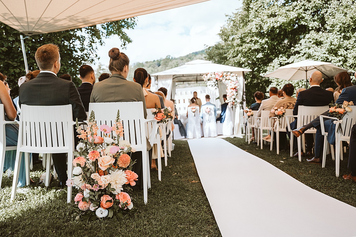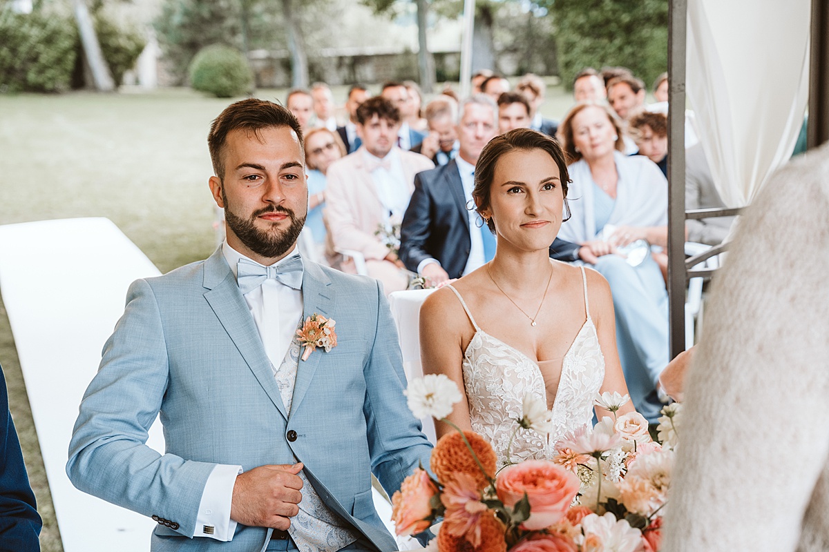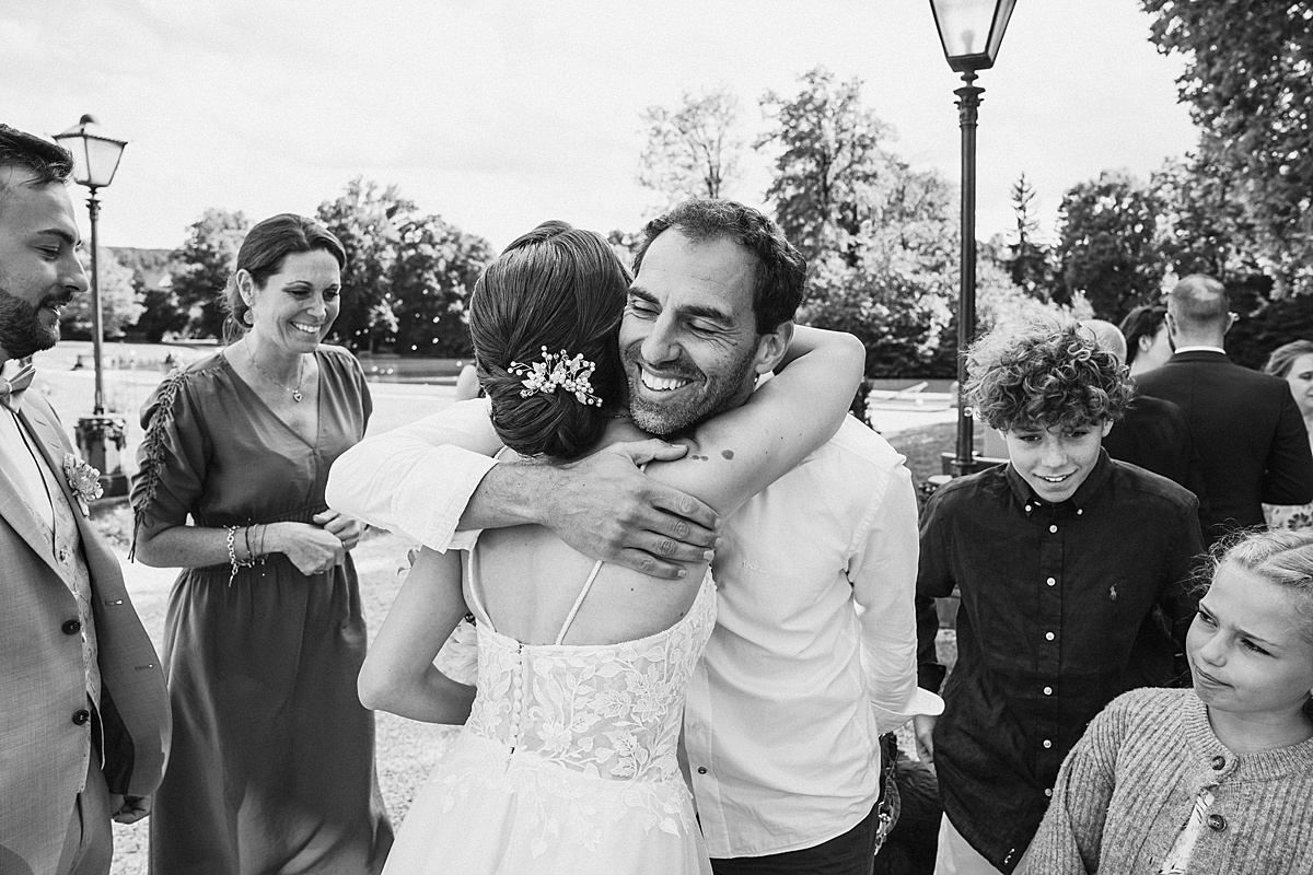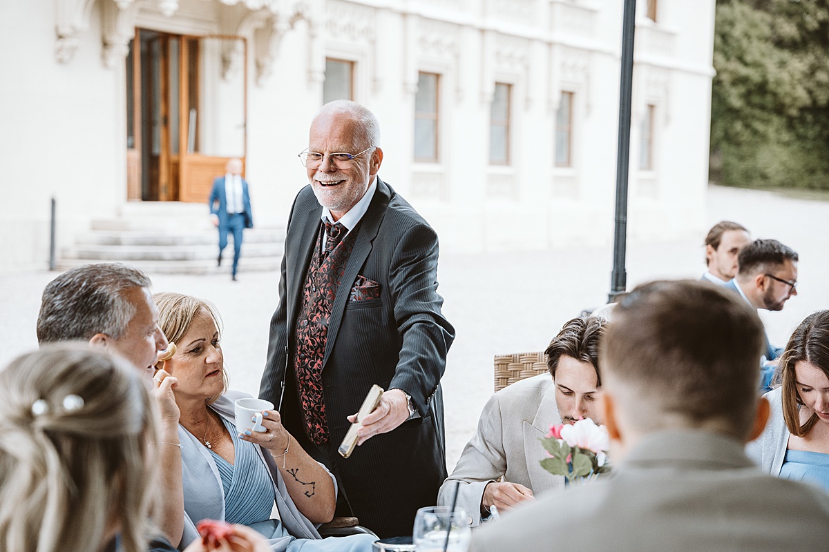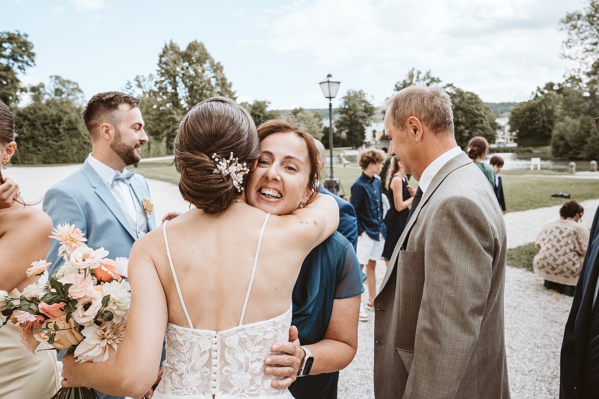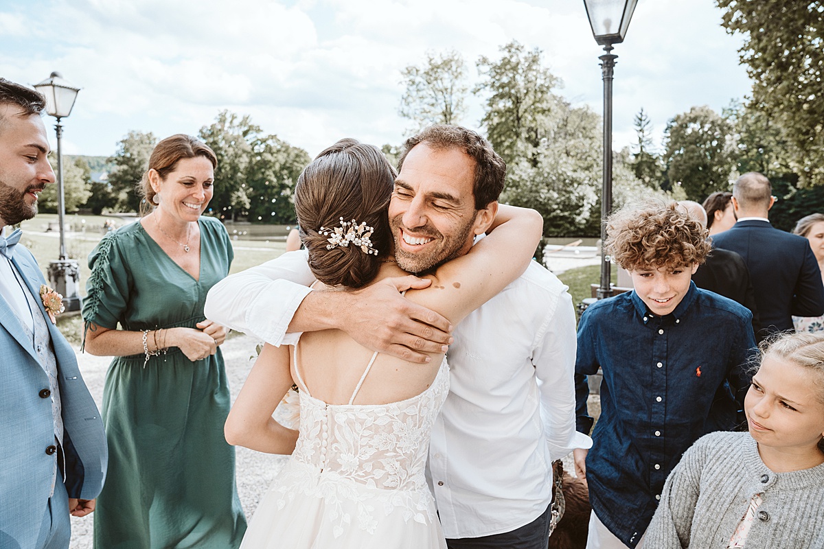 Die Trauung fand mit direktem Blick auf das Schloss statt – unter freiem Himmel, umgeben von Familie und Freunden. Mein Fokus lag darauf, echte Emotionen festzuhalten: Lächeln, Blicke, kleine Gesten – die Momente, die man nicht planen kann, die aber alles über den Tag erzählen.
