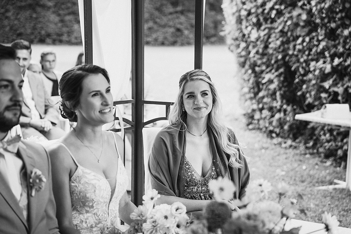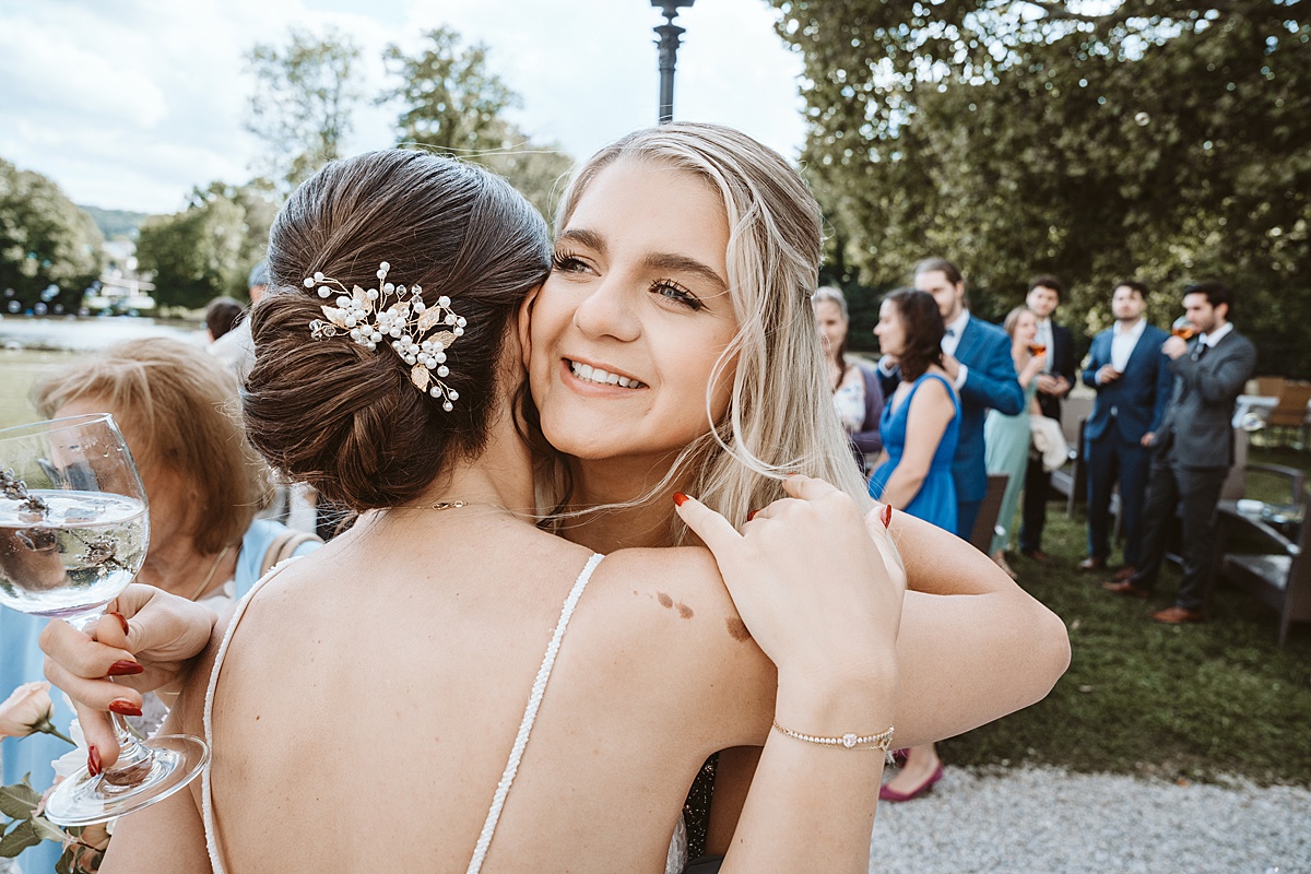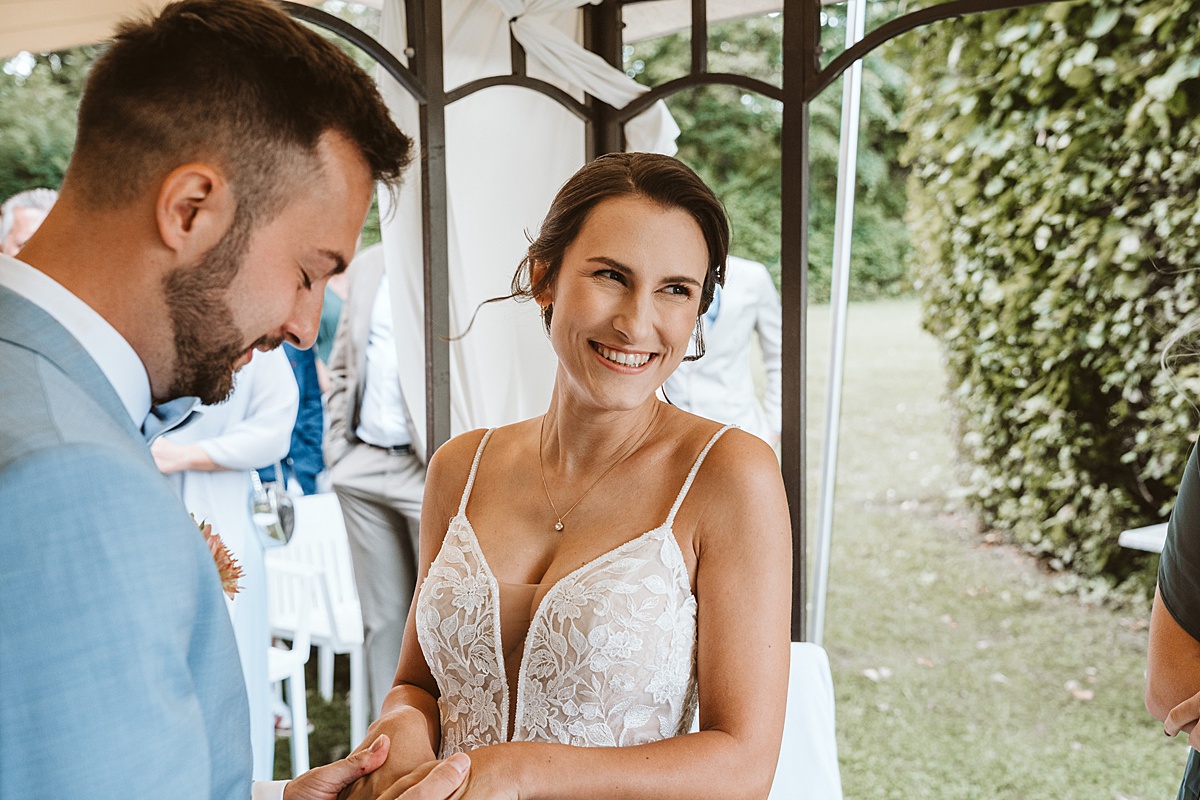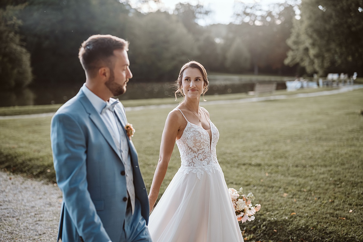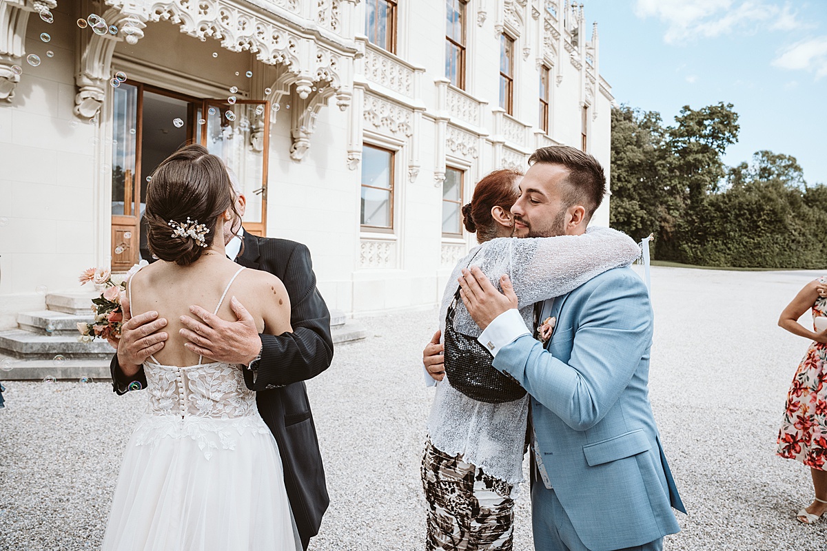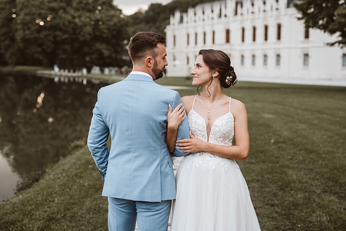 Die Trauung fand mit direktem Blick auf das Schloss statt – unter freiem Himmel, umgeben von Familie und Freunden. Mein Fokus lag darauf, echte Emotionen festzuhalten: Lächeln, Blicke, kleine Gesten – die Momente, die man nicht planen kann, die aber alles über den Tag erzählen.