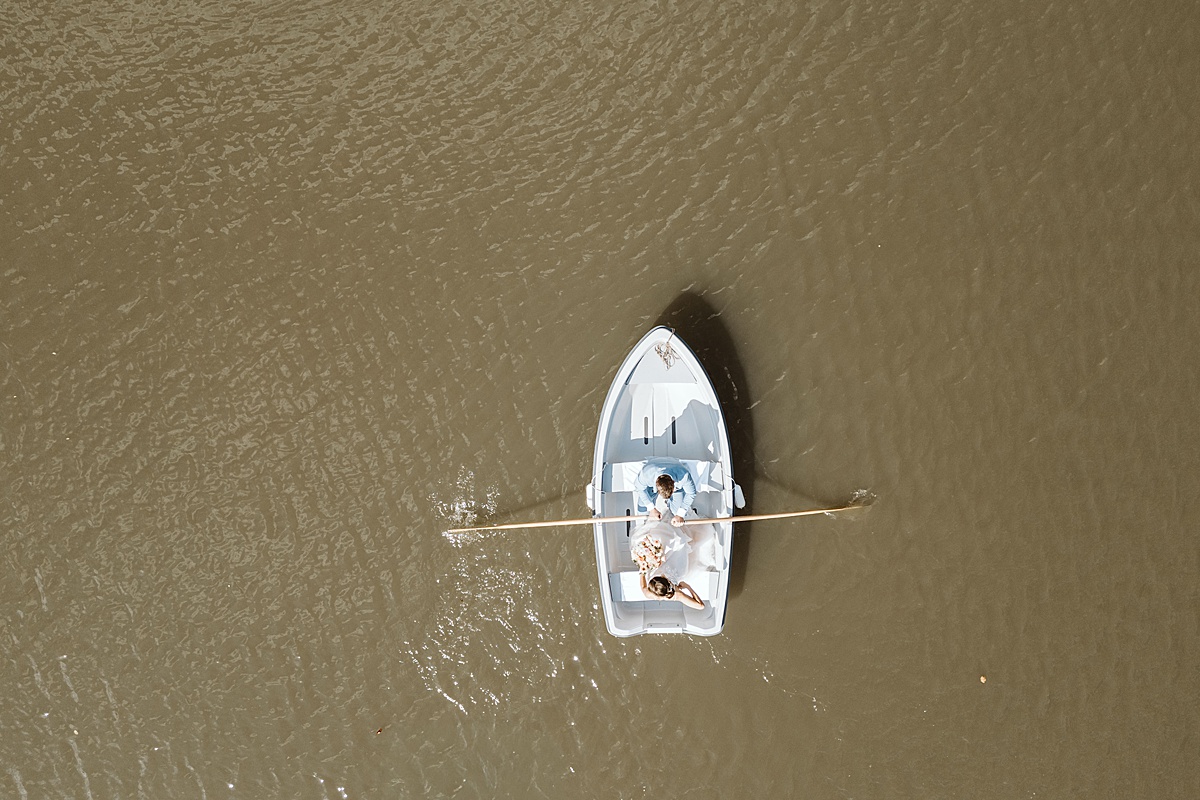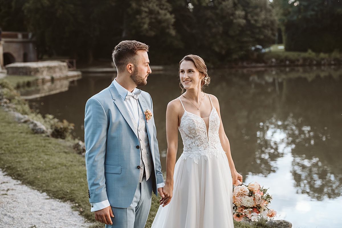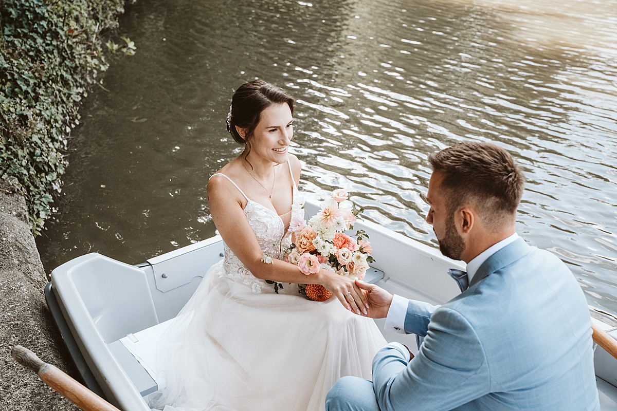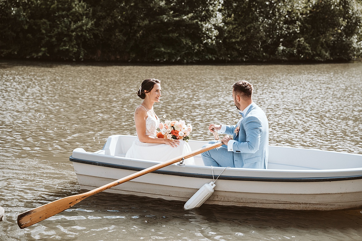 Nach der Trauung nutzten Kathrin und Ronny die Gelegenheit für eine kleine Auszeit. Sie stiegen in ein Ruderboot und fuhren über den Schlossteich – eine kurze Pause vom Trubel, ein Moment ganz für sich. Diese Szene war schlicht, ruhig und ehrlich – und genau das macht sie besonders. Kein Posen, kein Perfektionismus, nur zwei Menschen, die ihren Tag genießen.