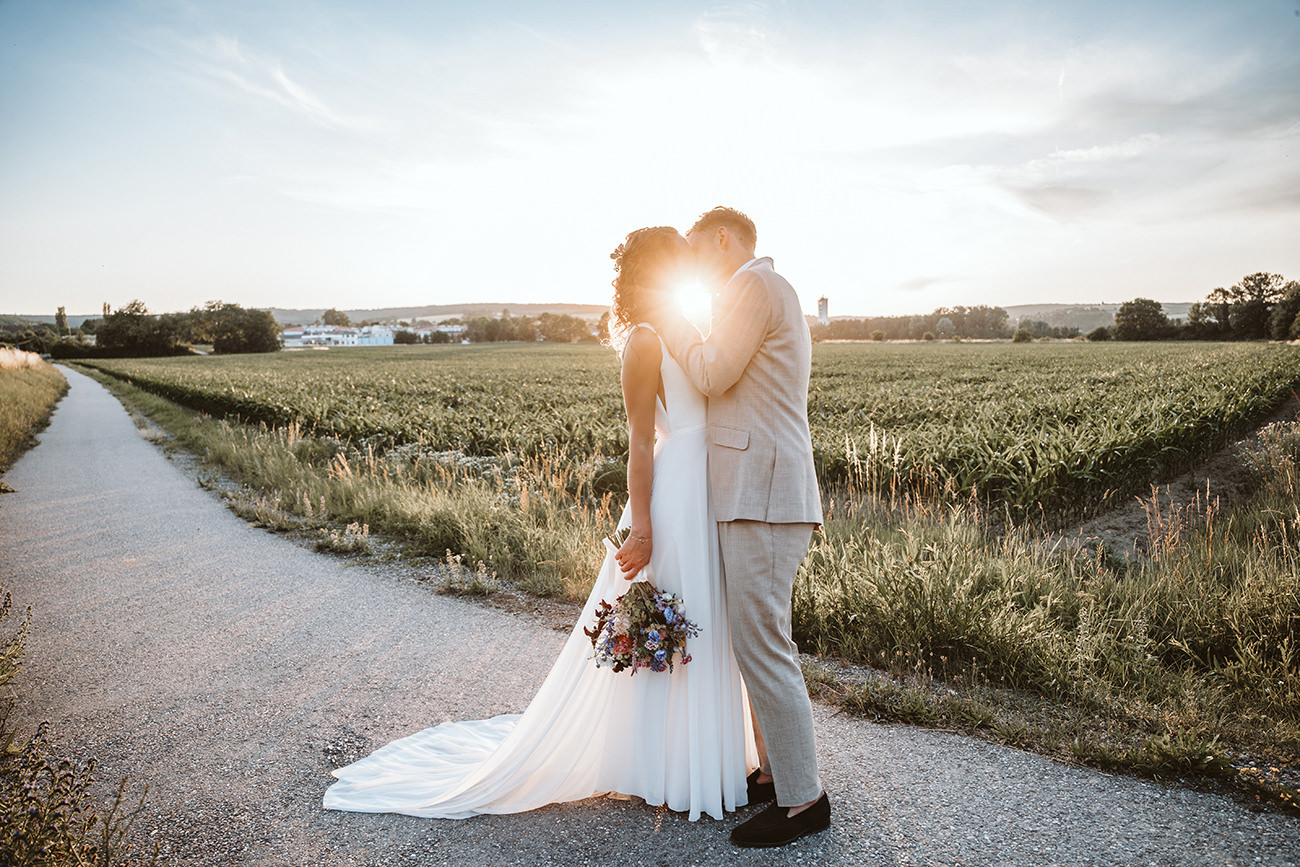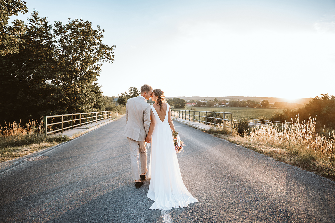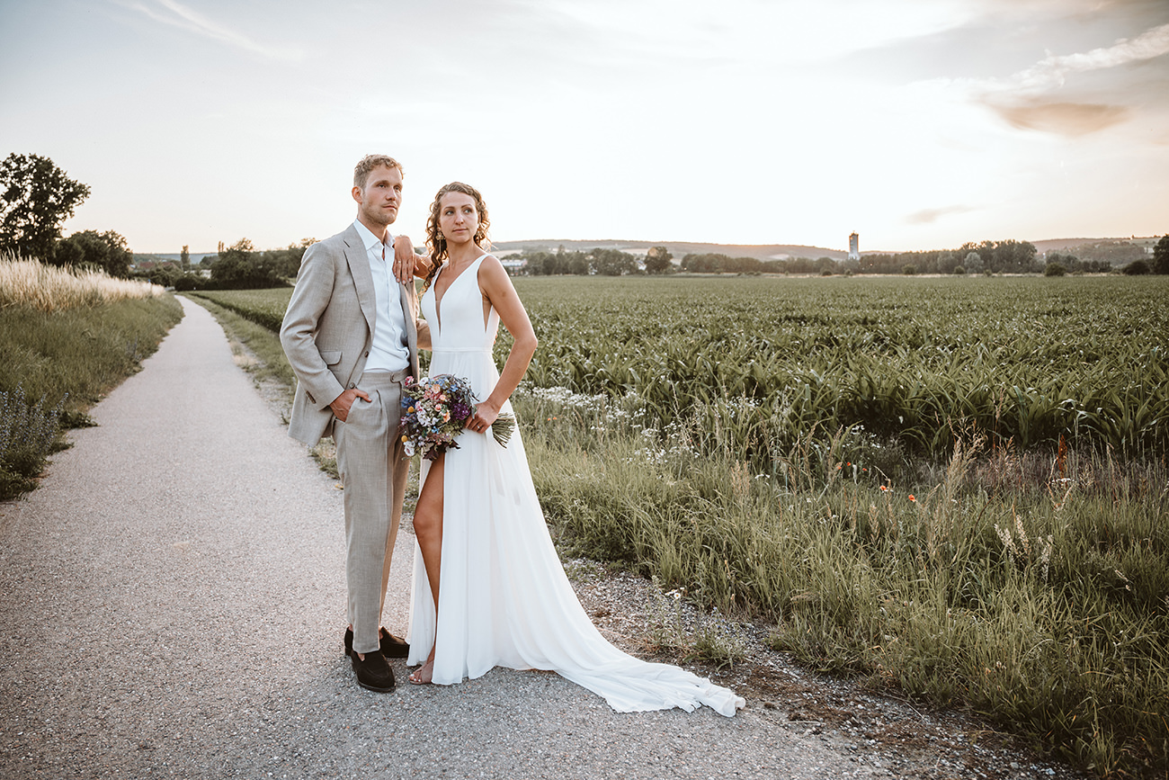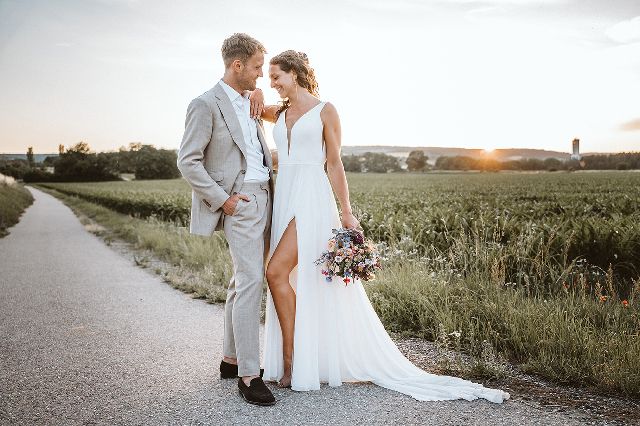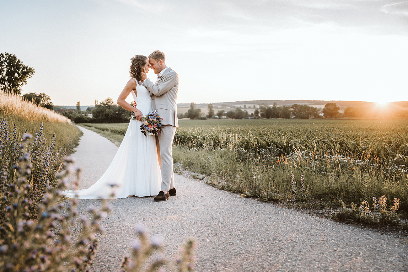 Die freie Trauung fand im Rosengarten statt und die Agape danach war geprägt von guter Musik, köstlichem Essen und jede Menge Spaß. Für die Brautpaarfotos haben wir uns zum Sonnenuntergang für das Feld direkt vor der Stadtflucht entschieden. Wobei wir vorher natürlich auch noch das ein oder andere Foto in der Location gemacht haben, die wirklich viel für Fotos hergibt.