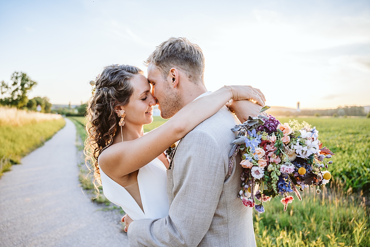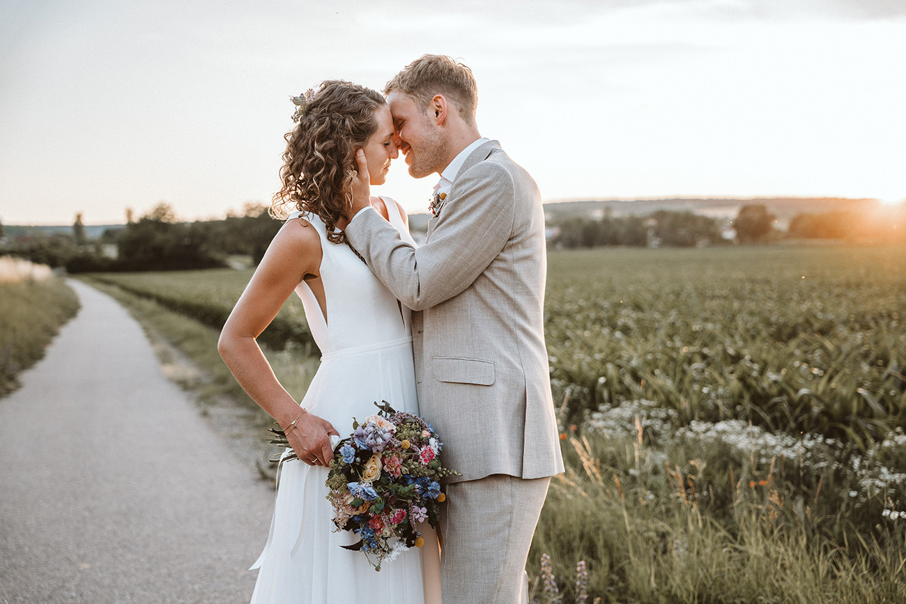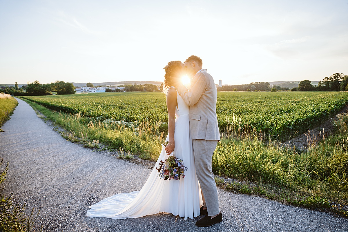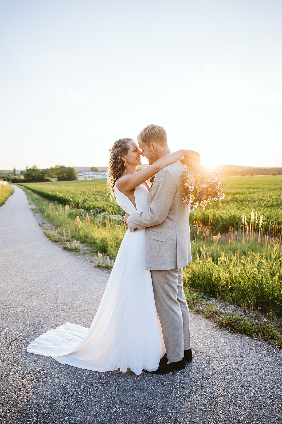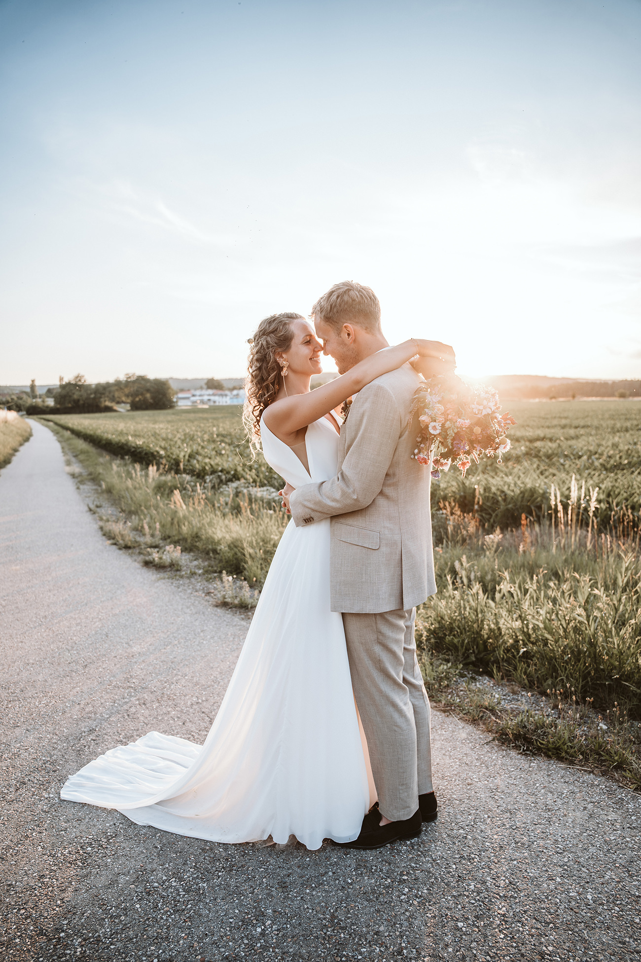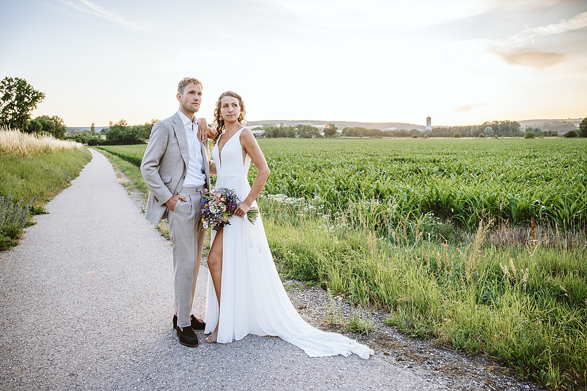 Die freie Trauung fand im Rosengarten statt und die Agape danach war geprägt von guter Musik, köstlichem Essen und jede Menge Spaß. Für die Brautpaarfotos haben wir uns zum Sonnenuntergang für das Feld direkt vor der Stadtflucht entschieden. Wobei wir vorher natürlich auch noch das ein oder andere Foto in der Location gemacht haben, die wirklich viel für Fotos hergibt.
