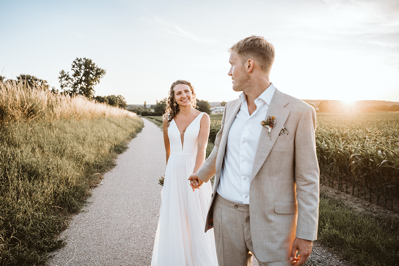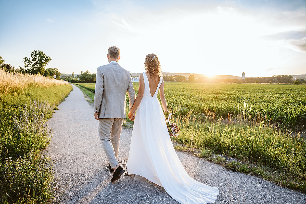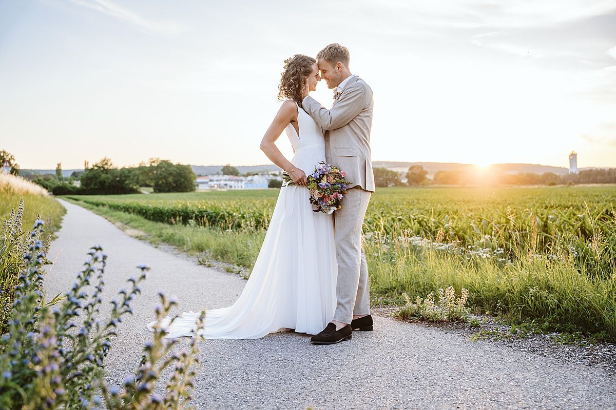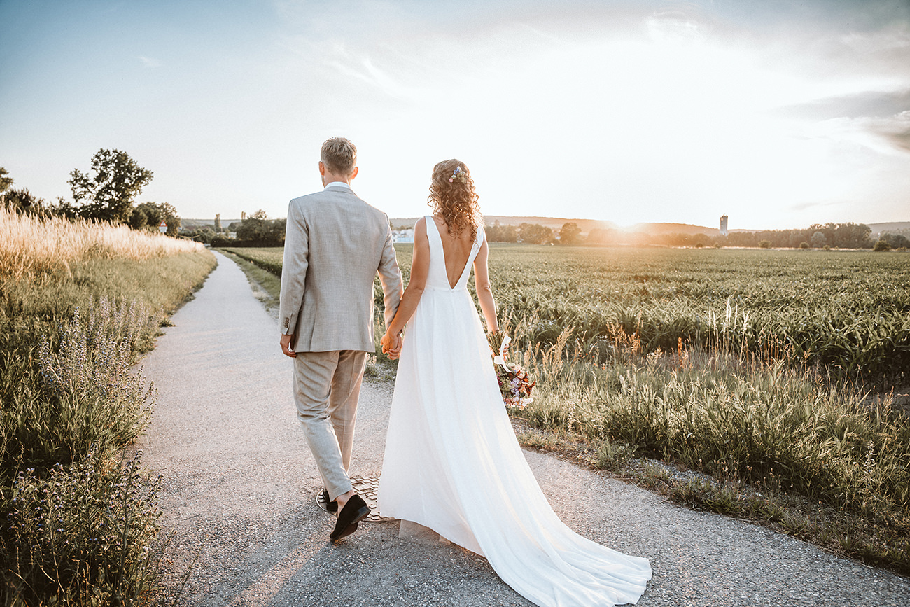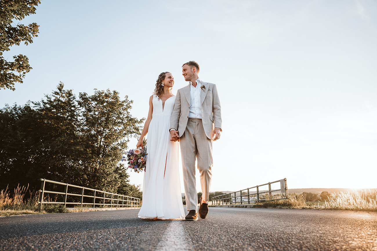 Die freie Trauung fand im Rosengarten statt und die Agape danach war geprägt von guter Musik, köstlichem Essen und jede Menge Spaß. Für die Brautpaarfotos haben wir uns zum Sonnenuntergang für das Feld direkt vor der Stadtflucht entschieden. Wobei wir vorher natürlich auch noch das ein oder andere Foto in der Location gemacht haben, die wirklich viel für Fotos hergibt.