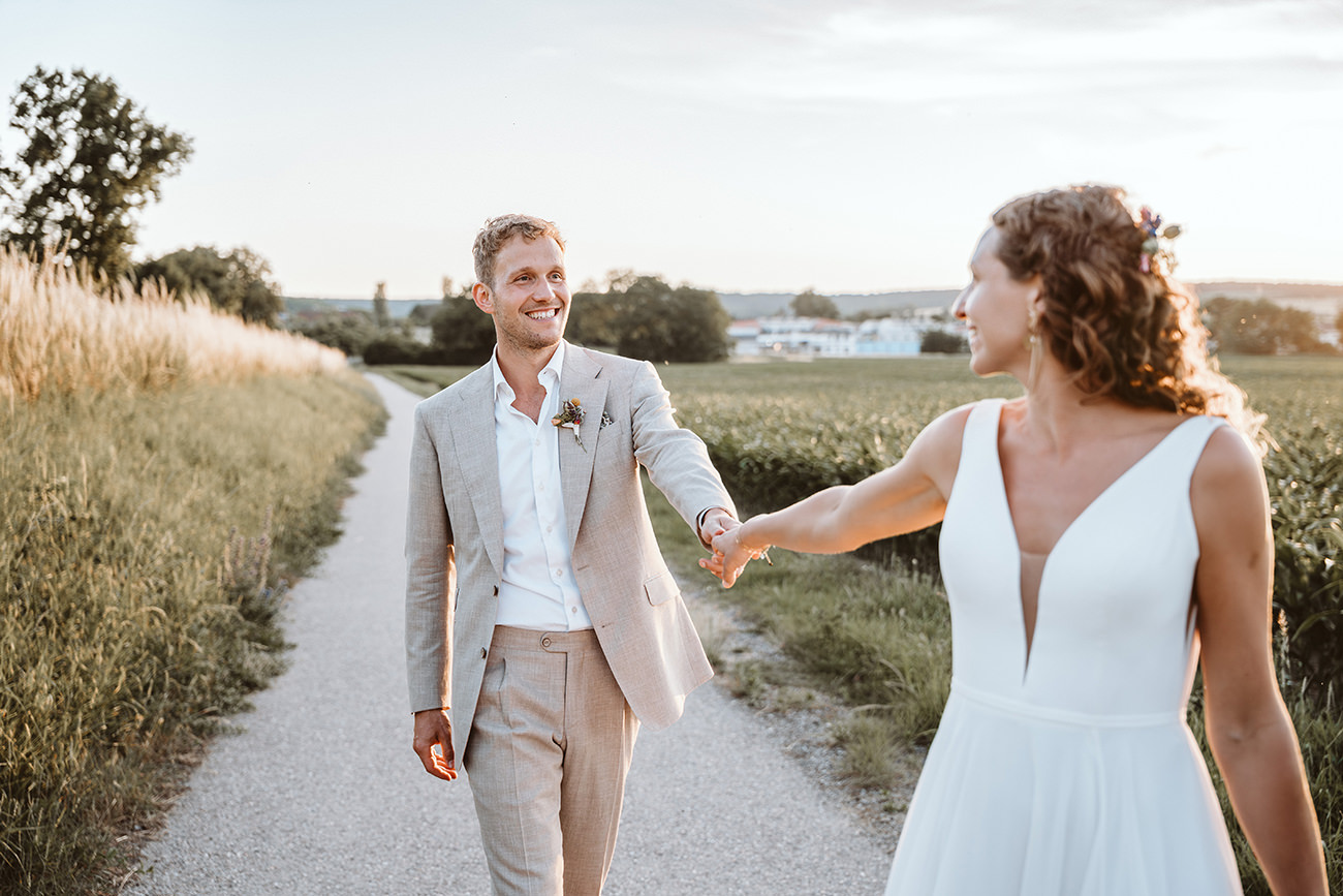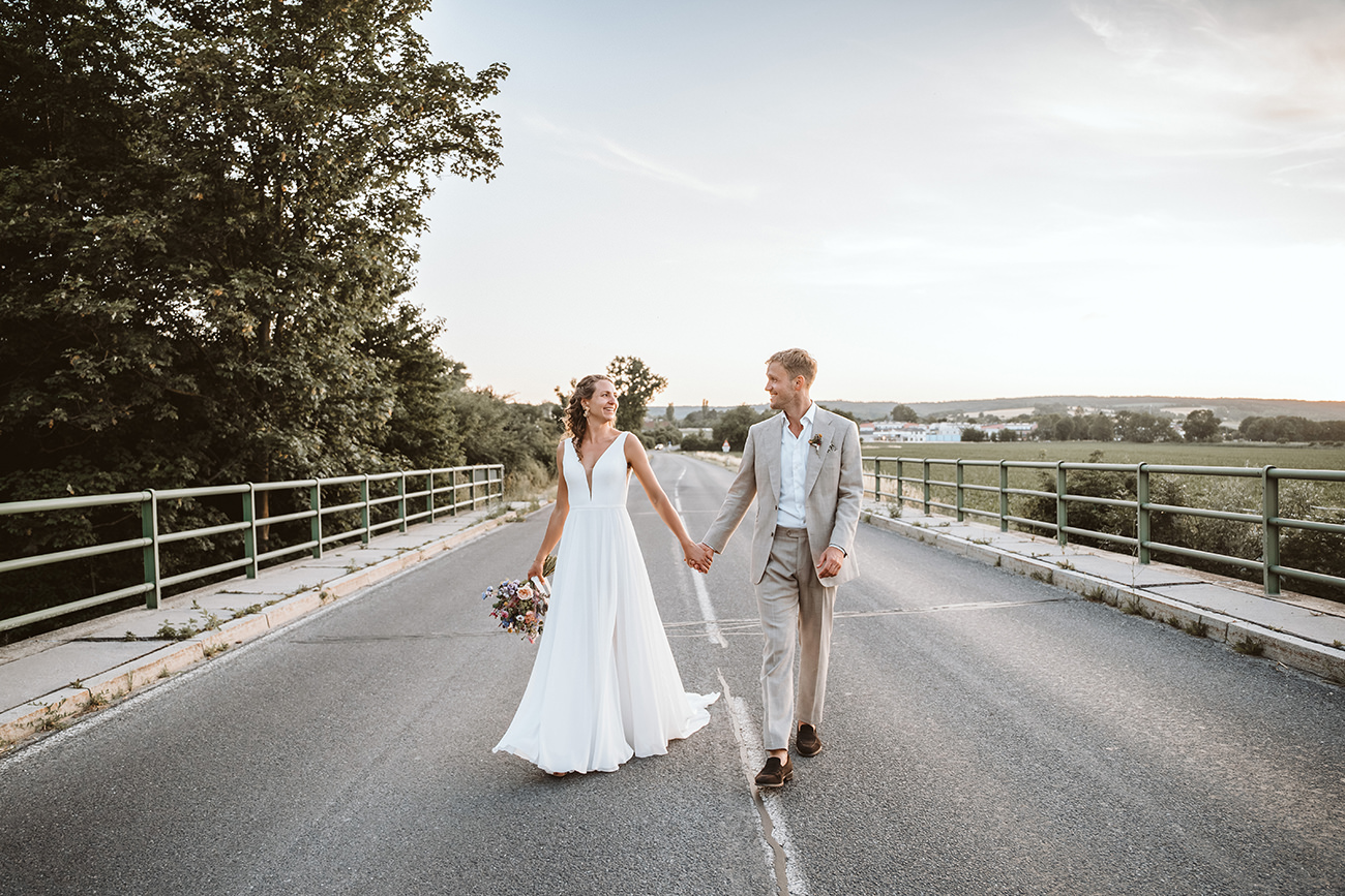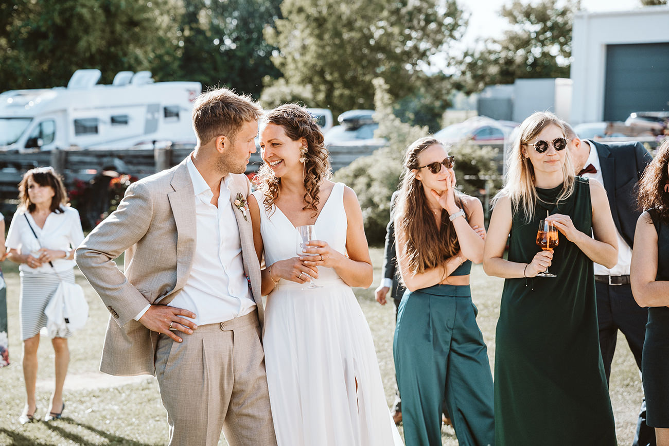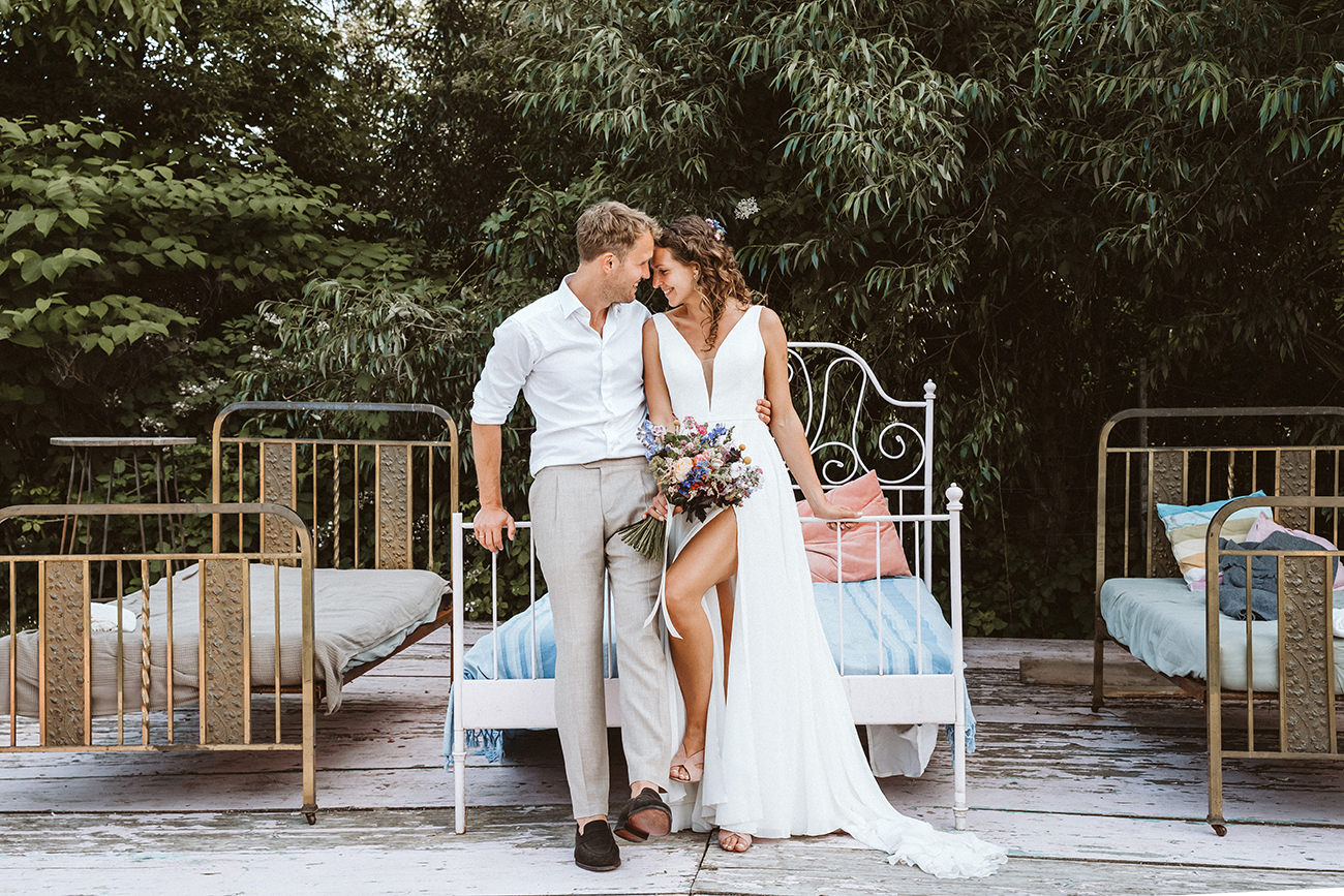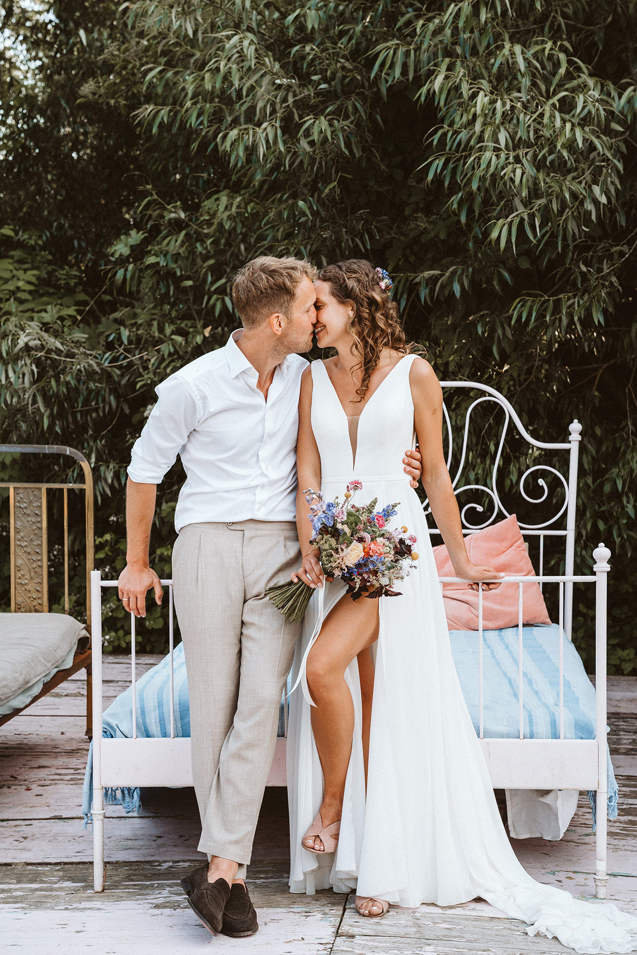 Die freie Trauung fand im Rosengarten statt und die Agape danach war geprägt von guter Musik, köstlichem Essen und jede Menge Spaß. Für die Brautpaarfotos haben wir uns zum Sonnenuntergang für das Feld direkt vor der Stadtflucht entschieden. Wobei wir vorher natürlich auch noch das ein oder andere Foto in der Location gemacht haben, die wirklich viel für Fotos hergibt.