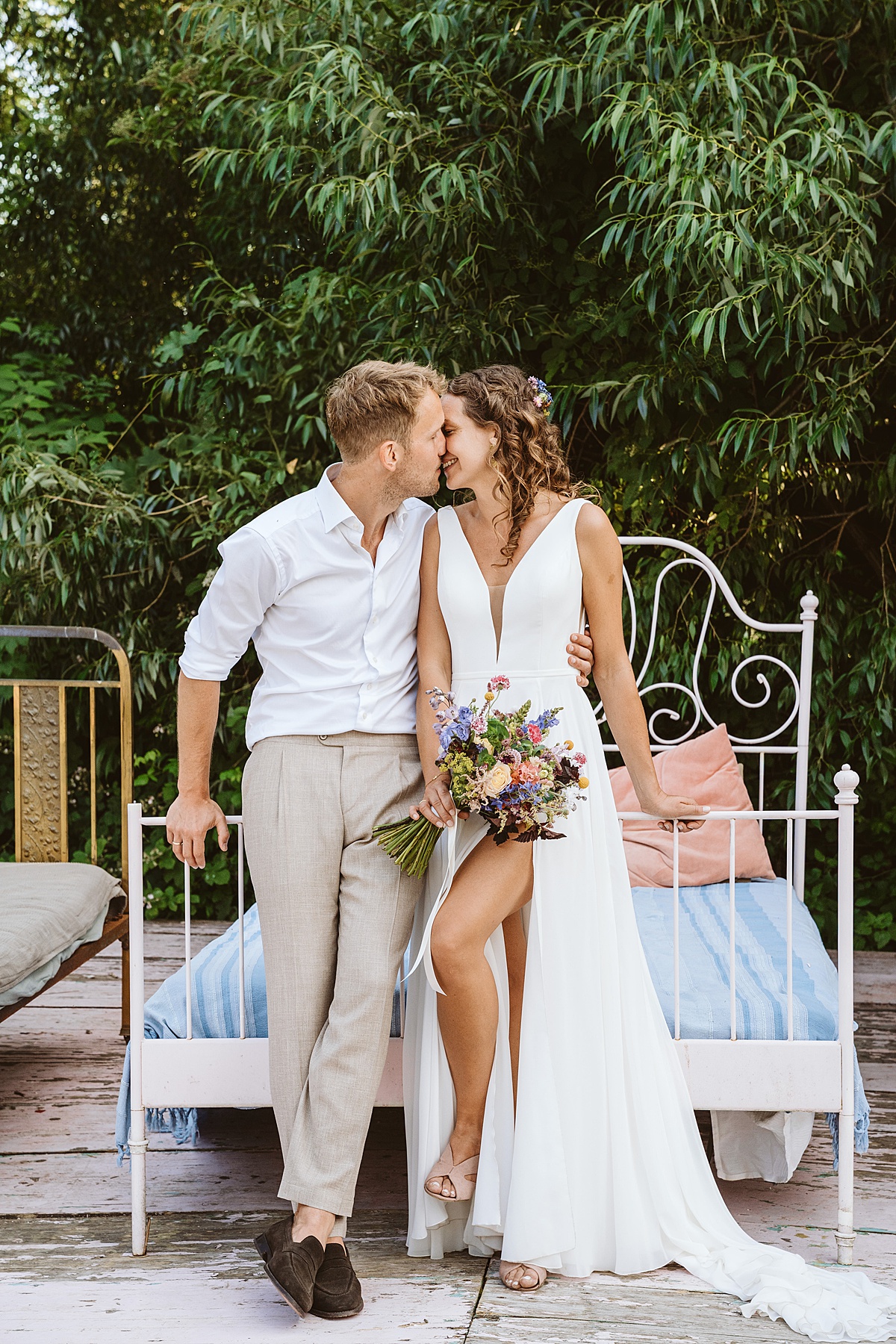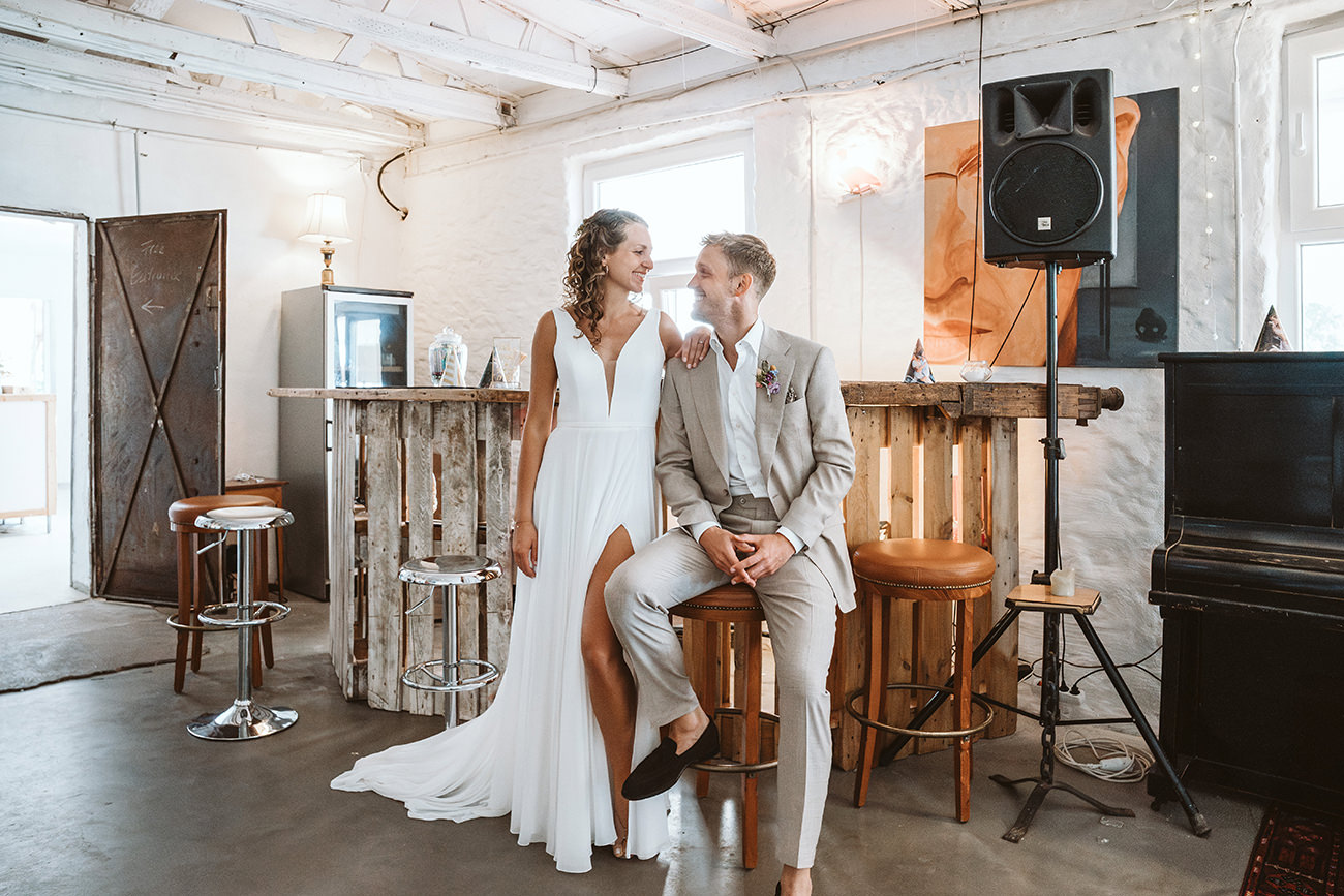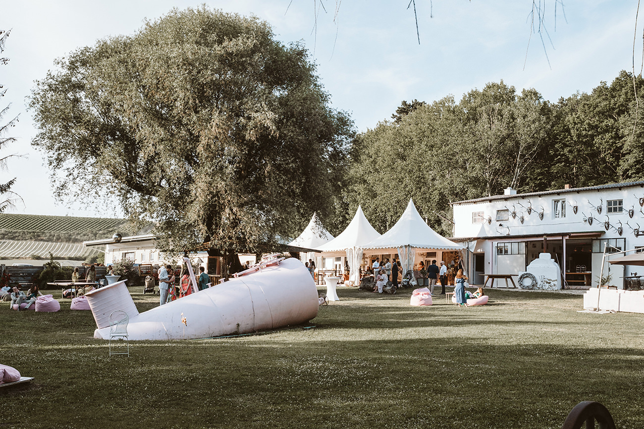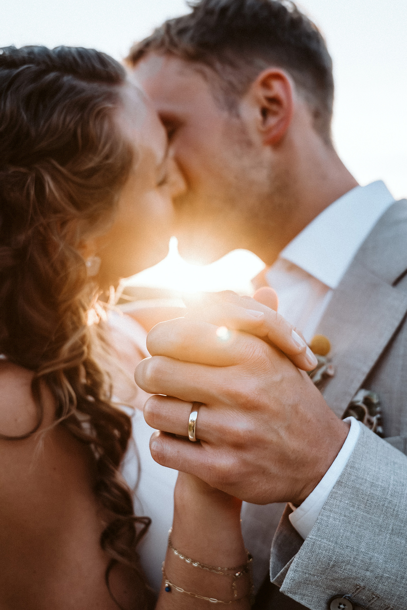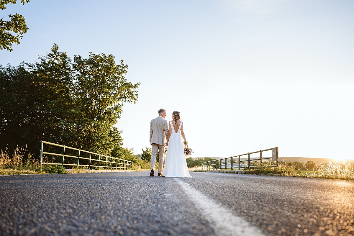 Die freie Trauung fand im Rosengarten statt und die Agape danach war geprägt von guter Musik, köstlichem Essen und jede Menge Spaß. Für die Brautpaarfotos haben wir uns zum Sonnenuntergang für das Feld direkt vor der Stadtflucht entschieden. Wobei wir vorher natürlich auch noch das ein oder andere Foto in der Location gemacht haben, die wirklich viel für Fotos hergibt.