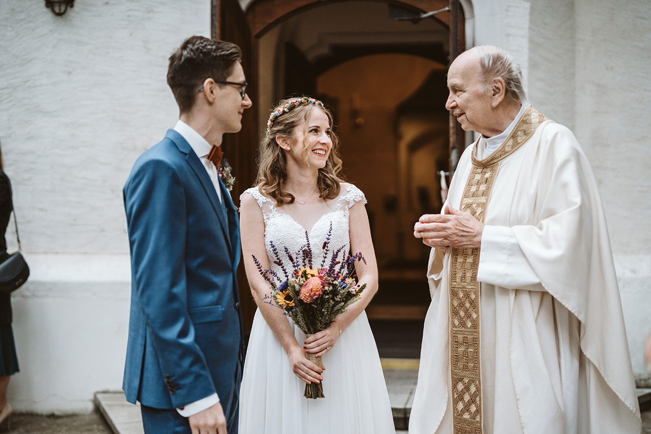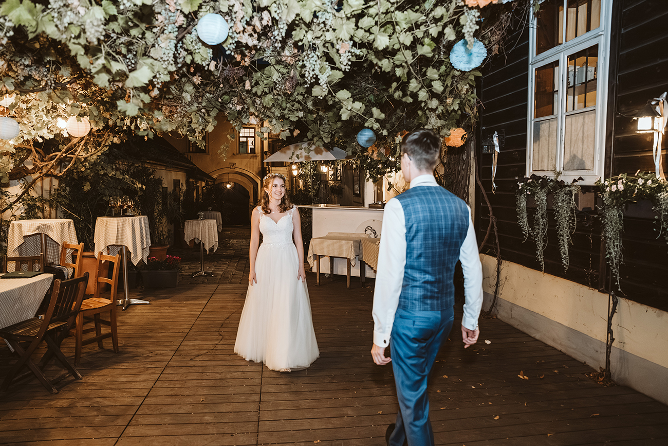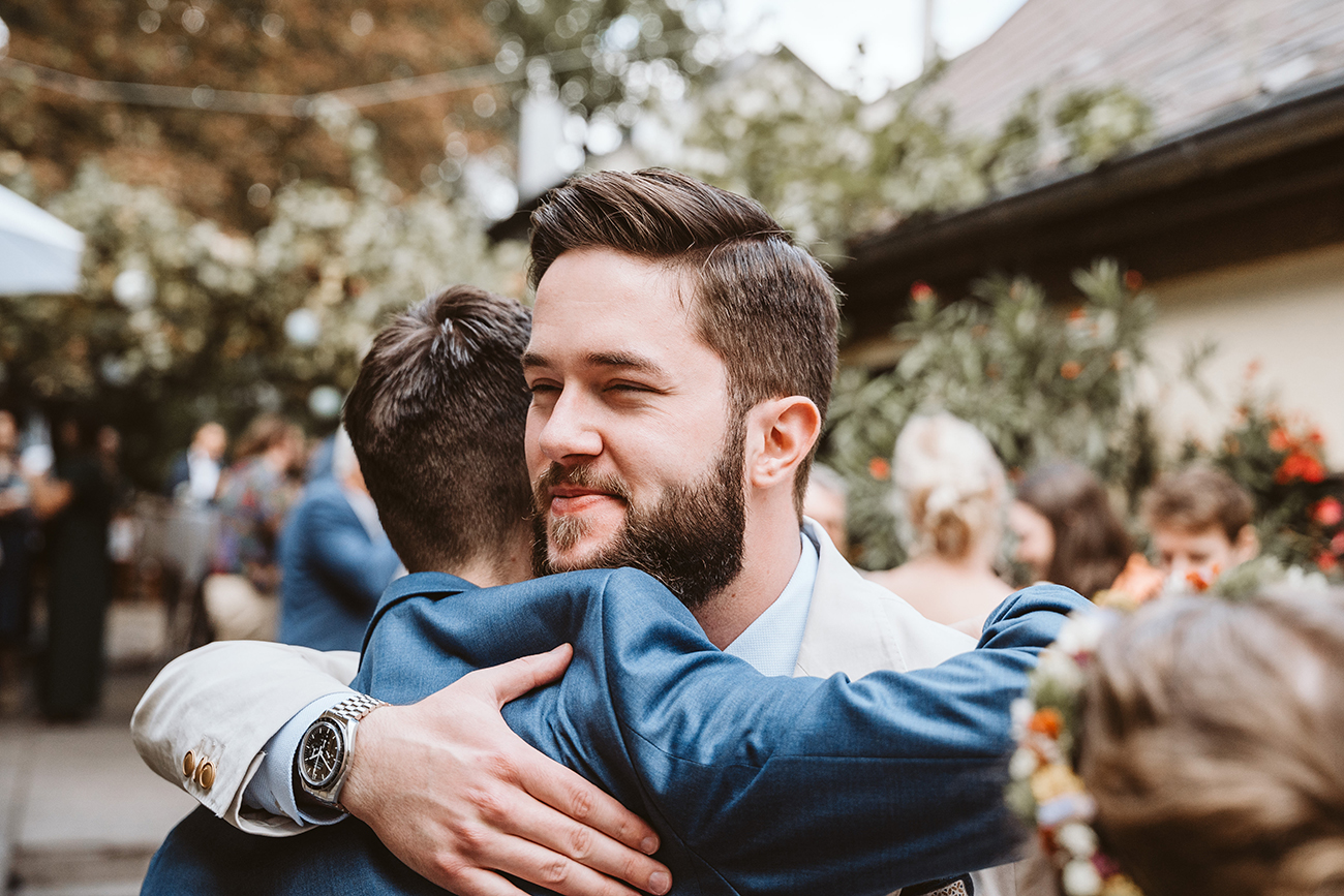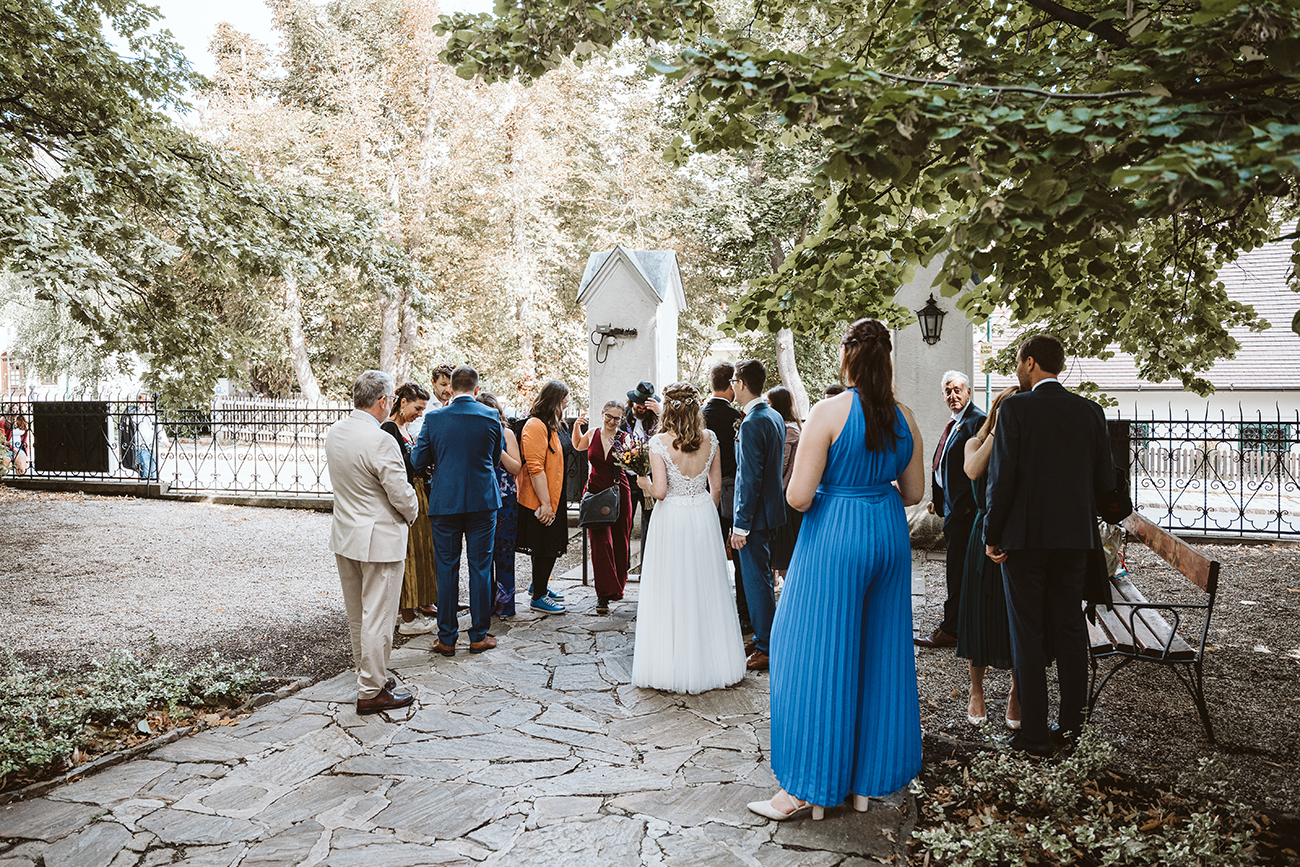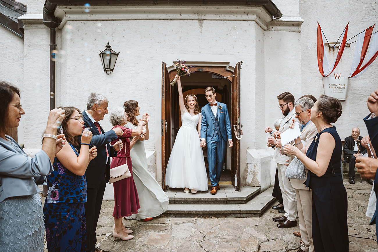 Anne-Sophie und Stefan entschieden sich für eine kirchliche Hochzeit in Wien, die genau zu ihnen passte: ehrlich, unkompliziert und ohne großen Schnickschnack. Gestartet hat der spätsommerliche Tag mit einem entspannten aber emotionalen First Look im Garten der Pfarrkirche Grinzing. Die beiden haben sich dort ein paar ruhige Minuten für sich genommen, bevor die Gäste eintrafen und die Trauung begann.