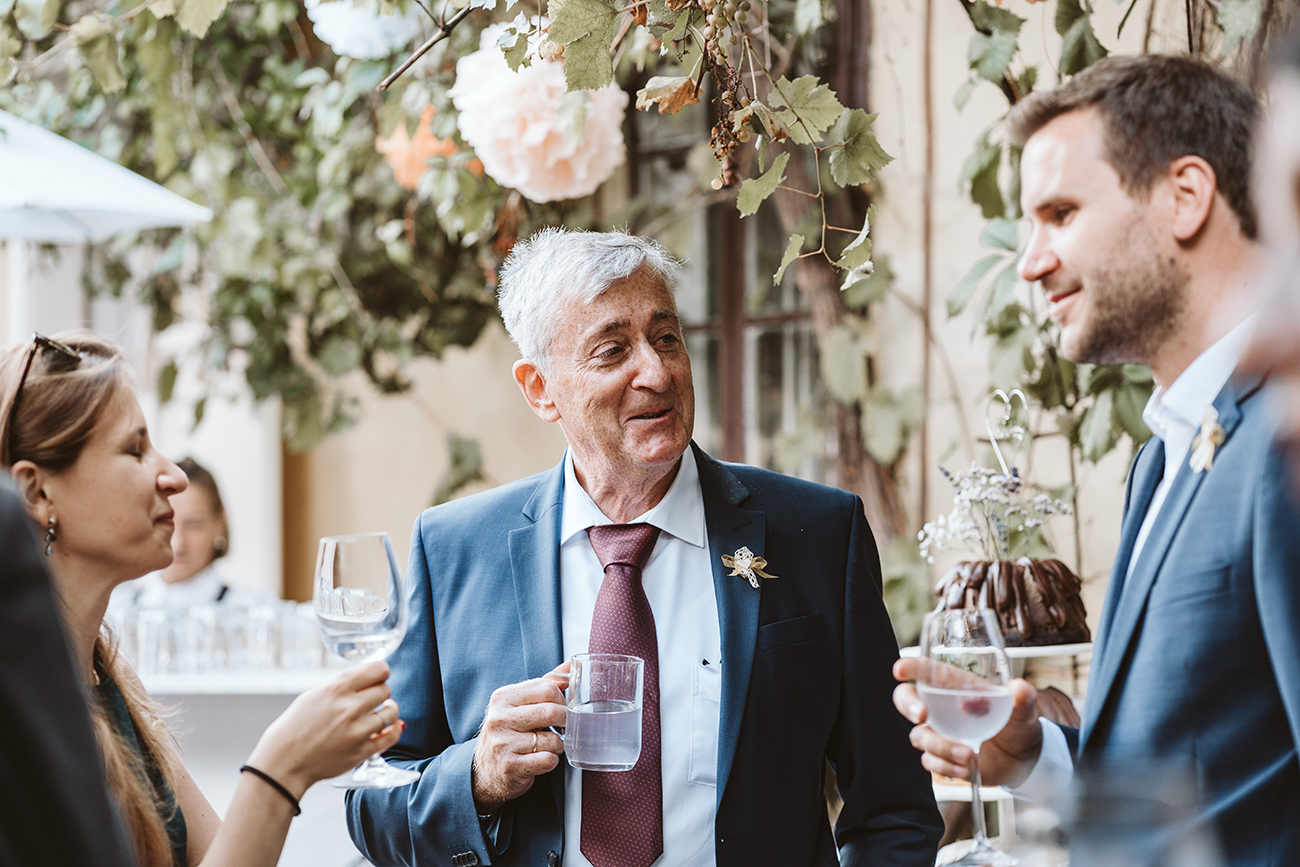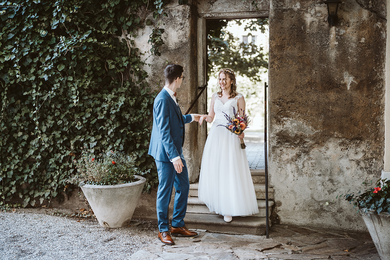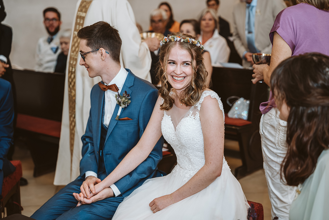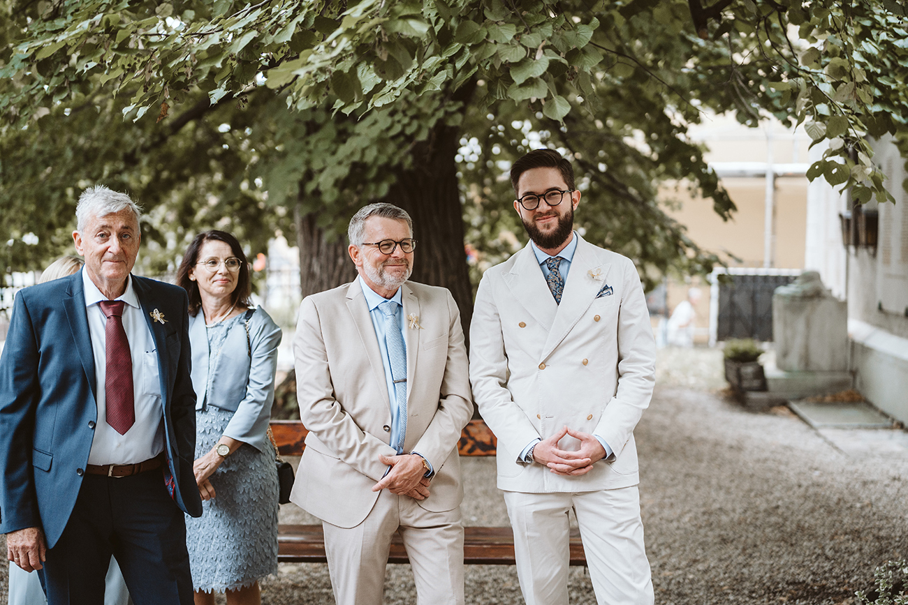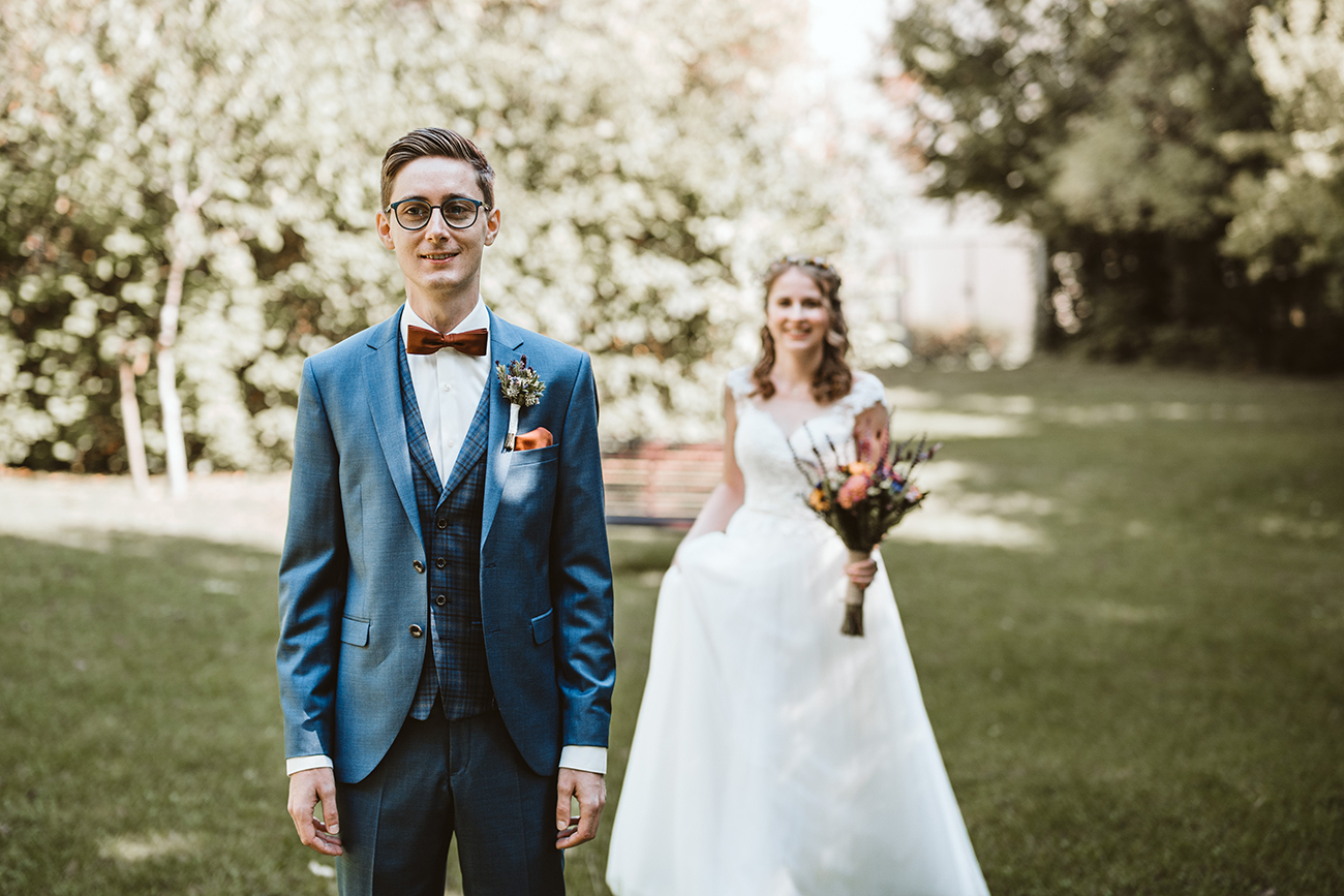 Anne-Sophie und Stefan entschieden sich für eine kirchliche Hochzeit in Wien, die genau zu ihnen passte: ehrlich, unkompliziert und ohne großen Schnickschnack. Gestartet hat der spätsommerliche Tag mit einem entspannten aber emotionalen First Look im Garten der Pfarrkirche Grinzing. Die beiden haben sich dort ein paar ruhige Minuten für sich genommen, bevor die Gäste eintrafen und die Trauung begann.