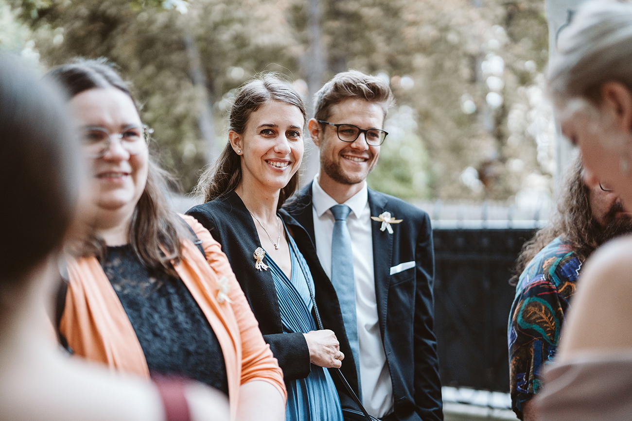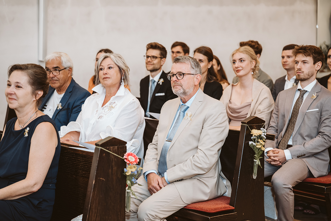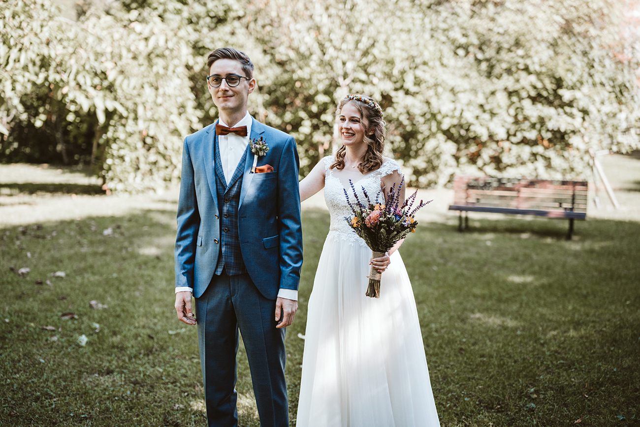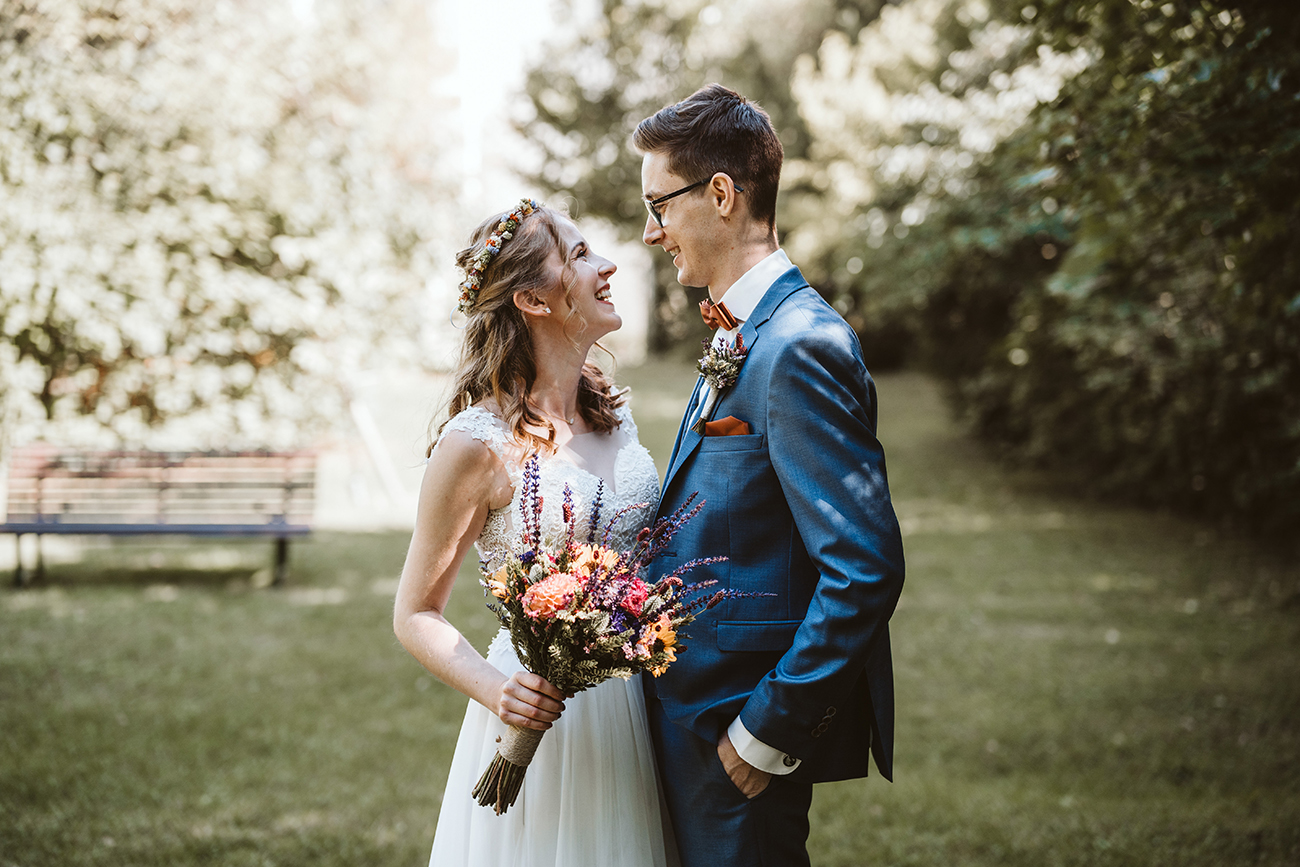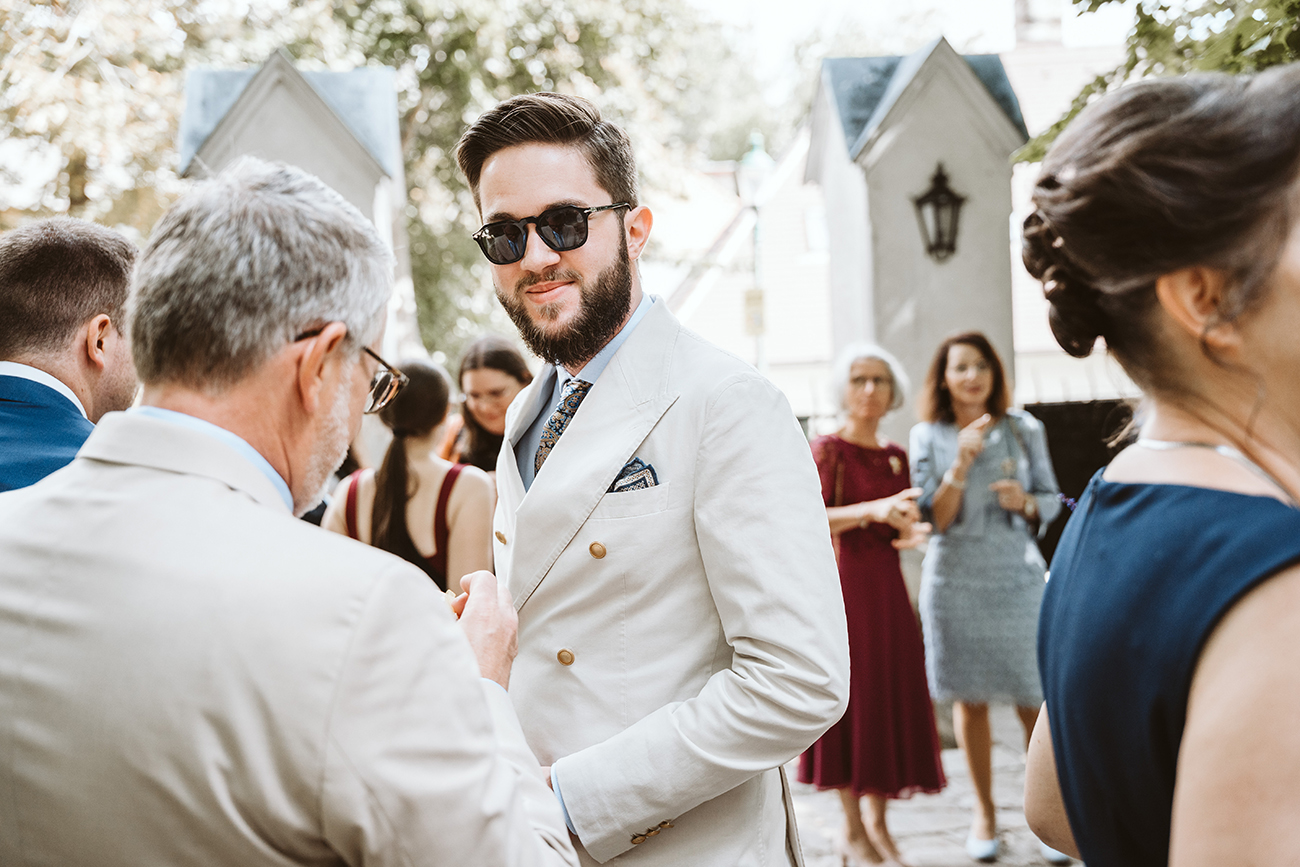 Anne-Sophie und Stefan entschieden sich für eine kirchliche Hochzeit in Wien, die genau zu ihnen passte: ehrlich, unkompliziert und ohne großen Schnickschnack. Gestartet hat der spätsommerliche Tag mit einem entspannten aber emotionalen First Look im Garten der Pfarrkirche Grinzing. Die beiden haben sich dort ein paar ruhige Minuten für sich genommen, bevor die Gäste eintrafen und die Trauung begann.