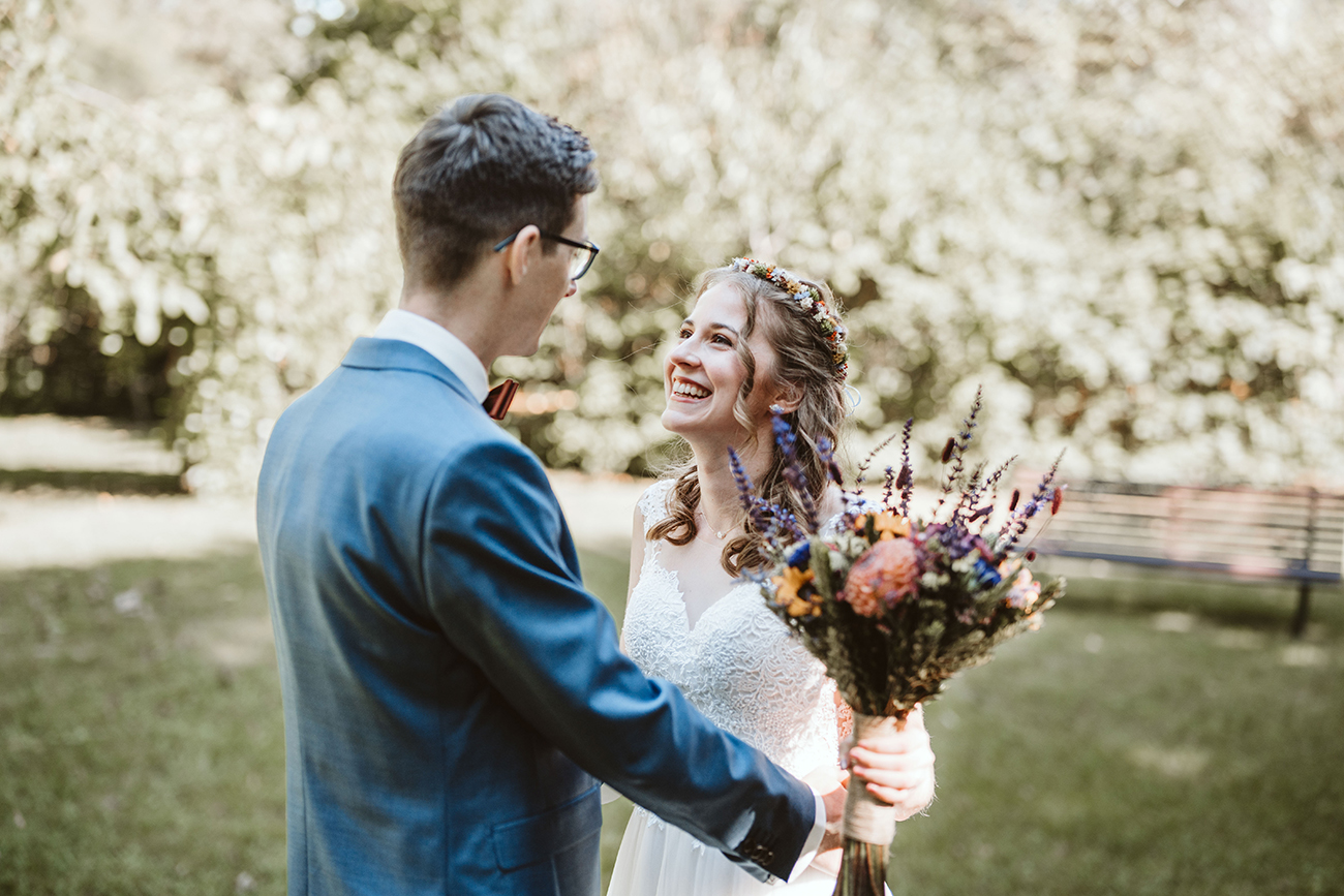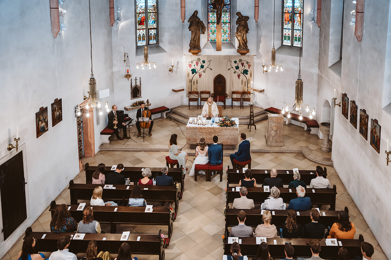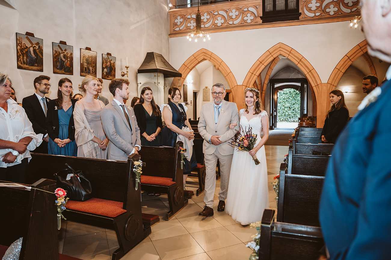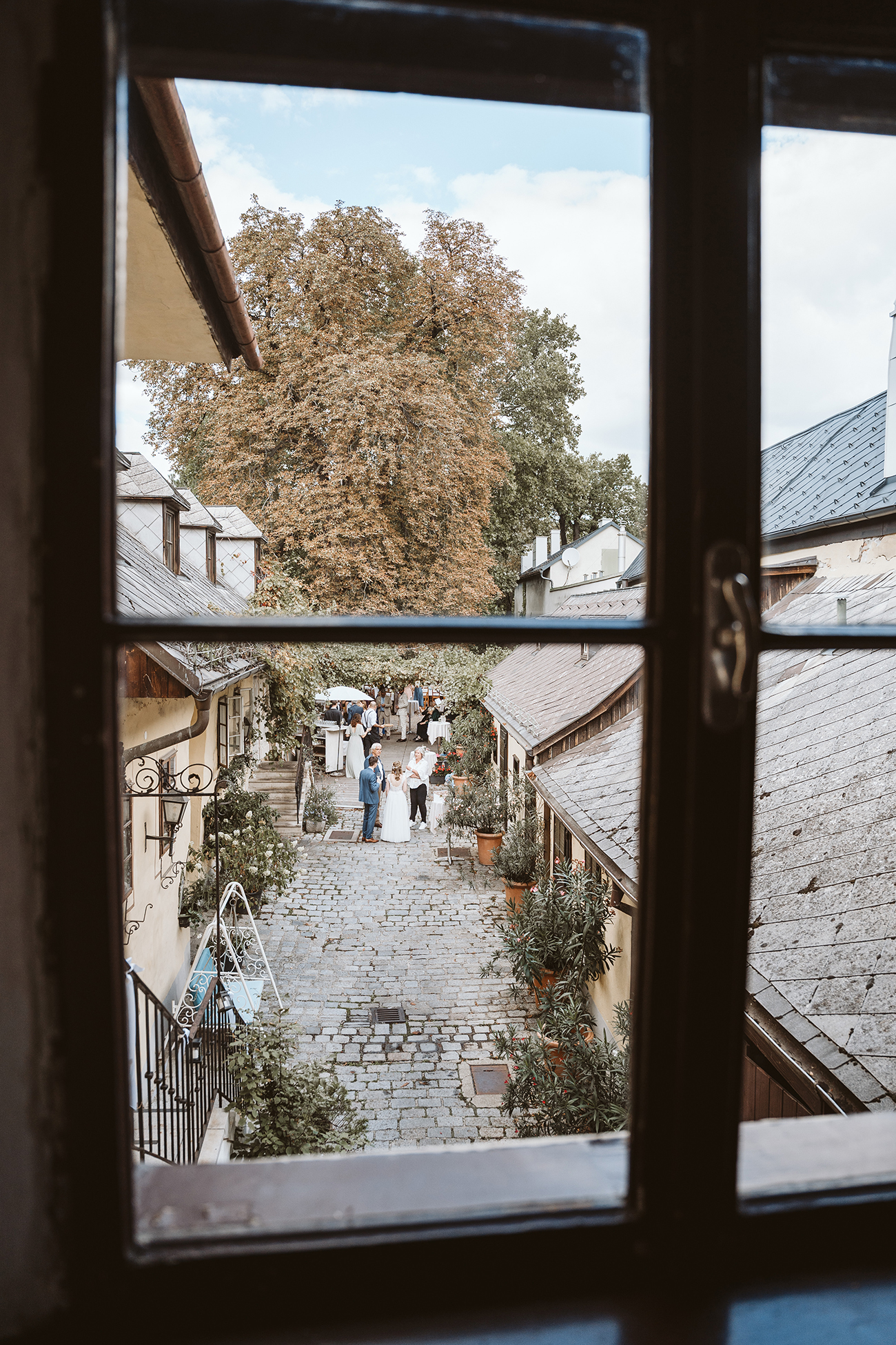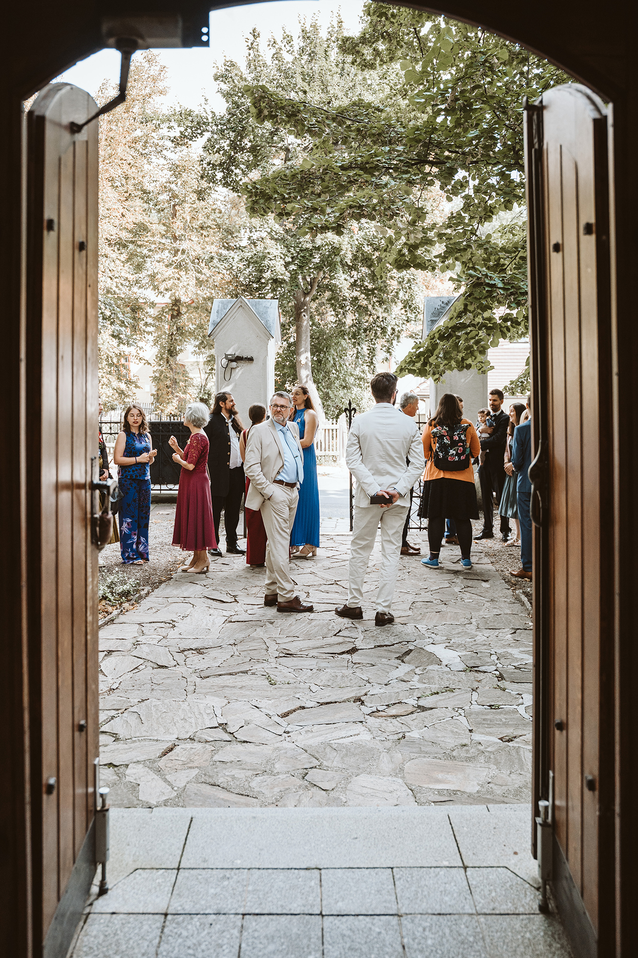 Anne-Sophie und Stefan entschieden sich für eine kirchliche Hochzeit in Wien, die genau zu ihnen passte: ehrlich, unkompliziert und ohne großen Schnickschnack. Gestartet hat der spätsommerliche Tag mit einem entspannten aber emotionalen First Look im Garten der Pfarrkirche Grinzing. Die beiden haben sich dort ein paar ruhige Minuten für sich genommen, bevor die Gäste eintrafen und die Trauung begann.
