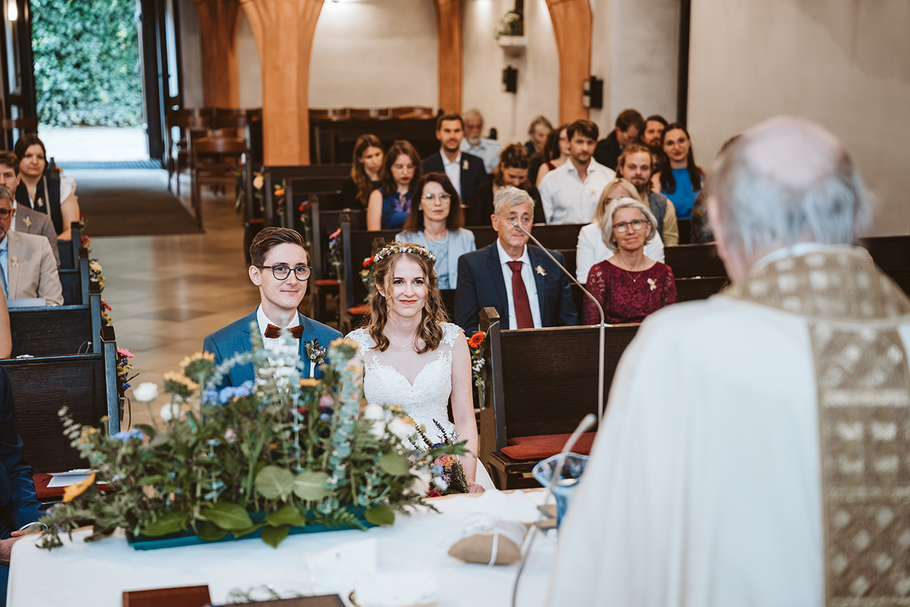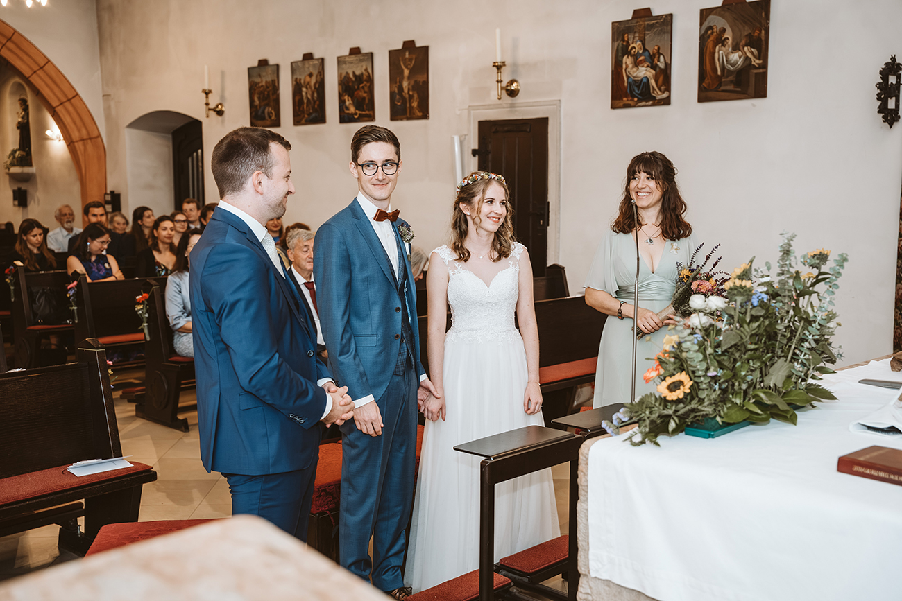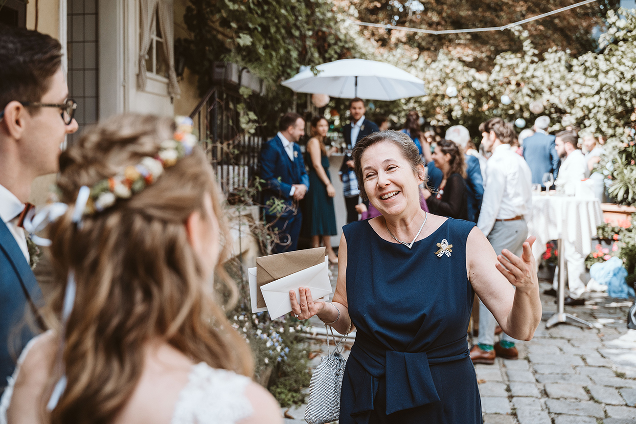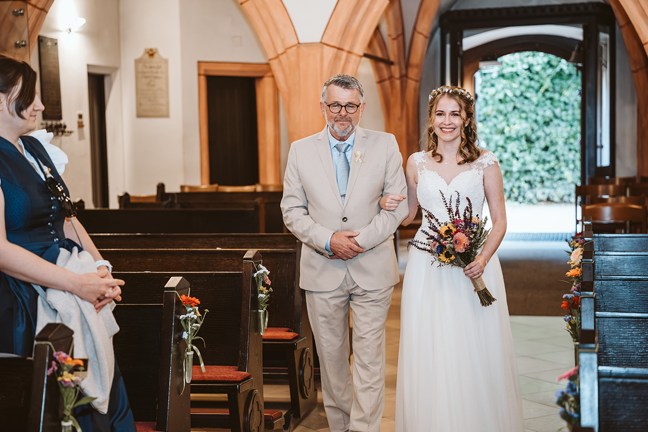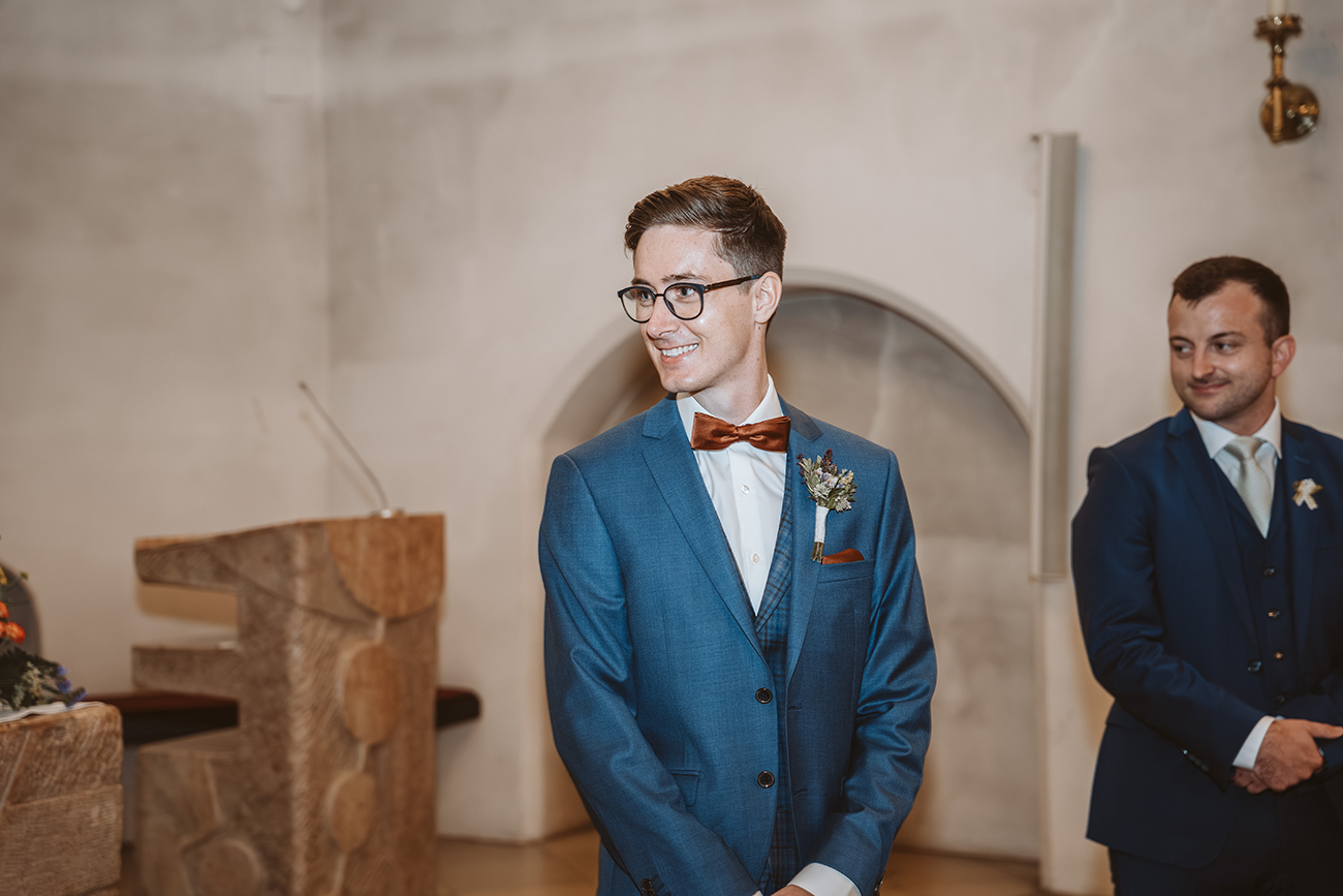 Anne-Sophie und Stefan entschieden sich für eine kirchliche Hochzeit in Wien, die genau zu ihnen passte: ehrlich, unkompliziert und ohne großen Schnickschnack. Gestartet hat der spätsommerliche Tag mit einem entspannten aber emotionalen First Look im Garten der Pfarrkirche Grinzing. Die beiden haben sich dort ein paar ruhige Minuten für sich genommen, bevor die Gäste eintrafen und die Trauung begann.