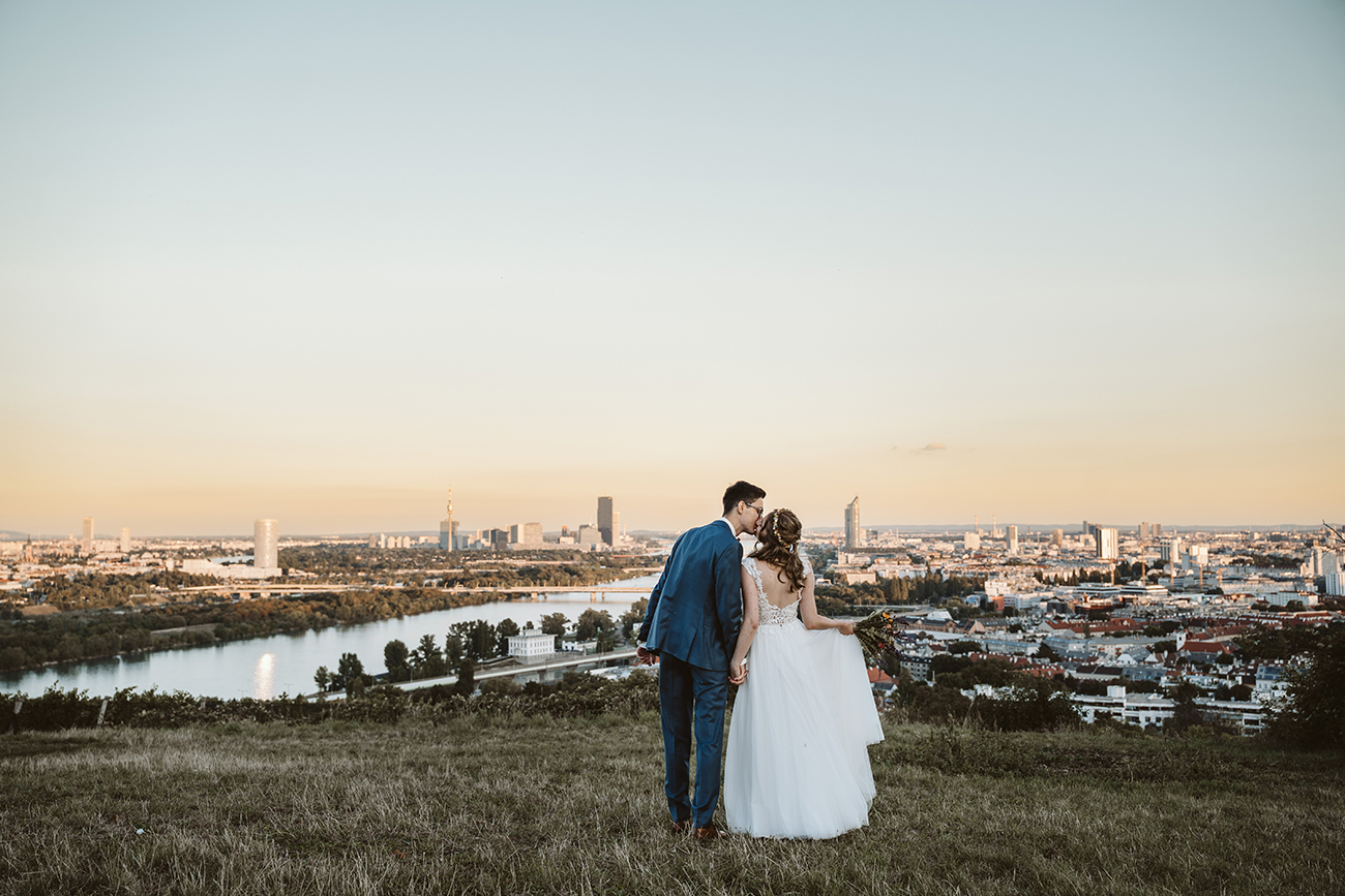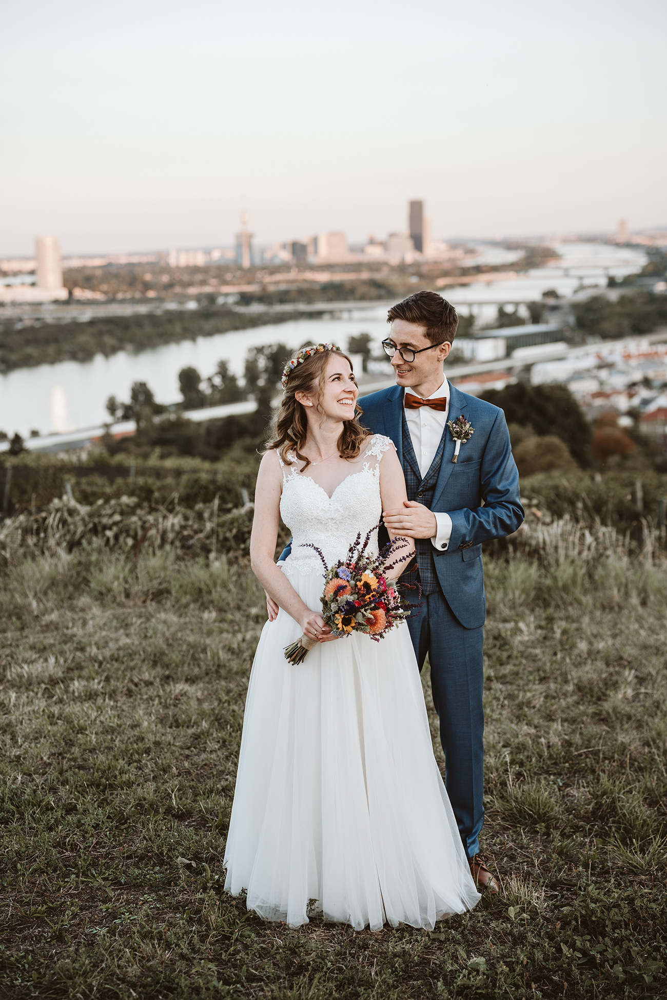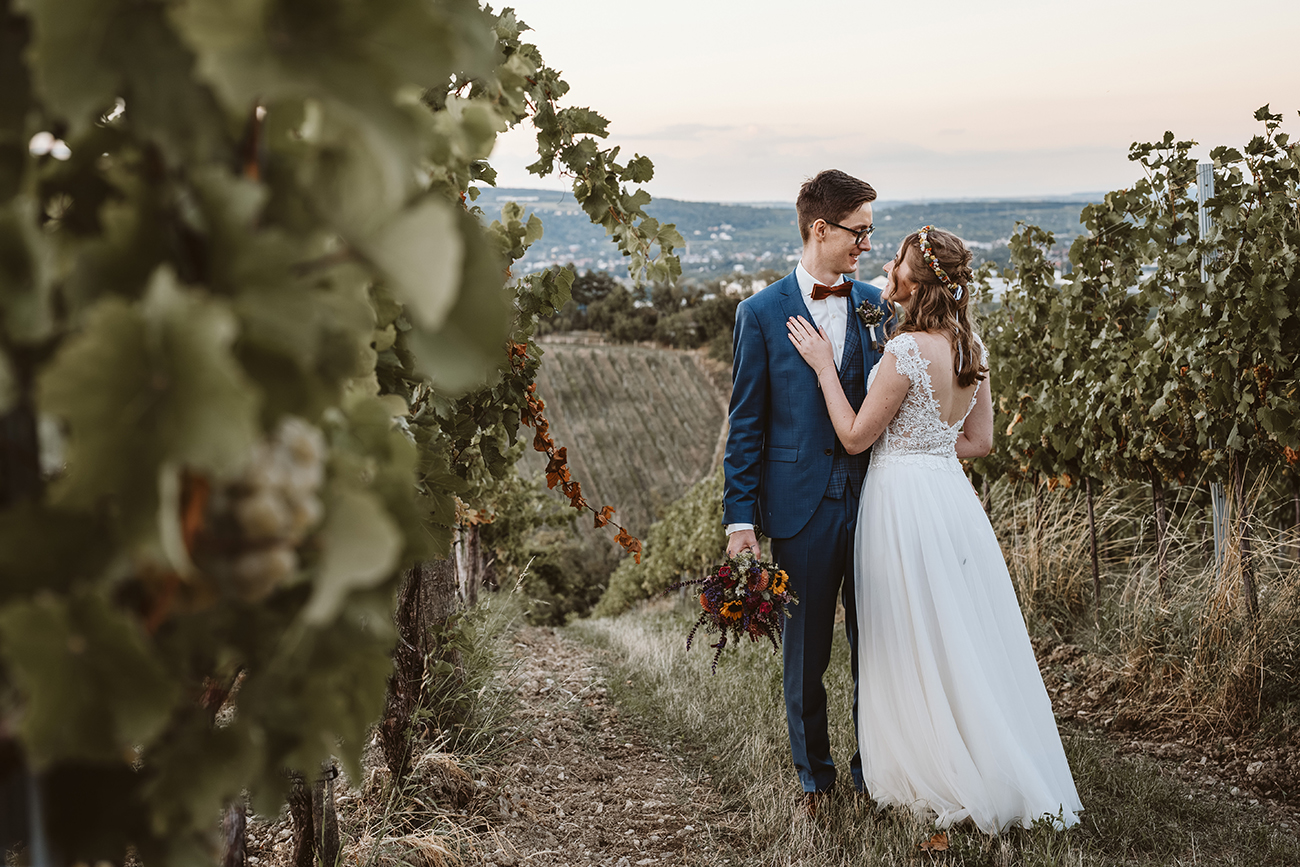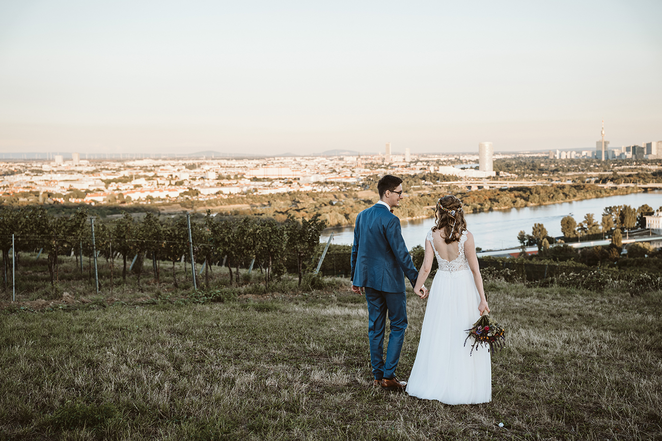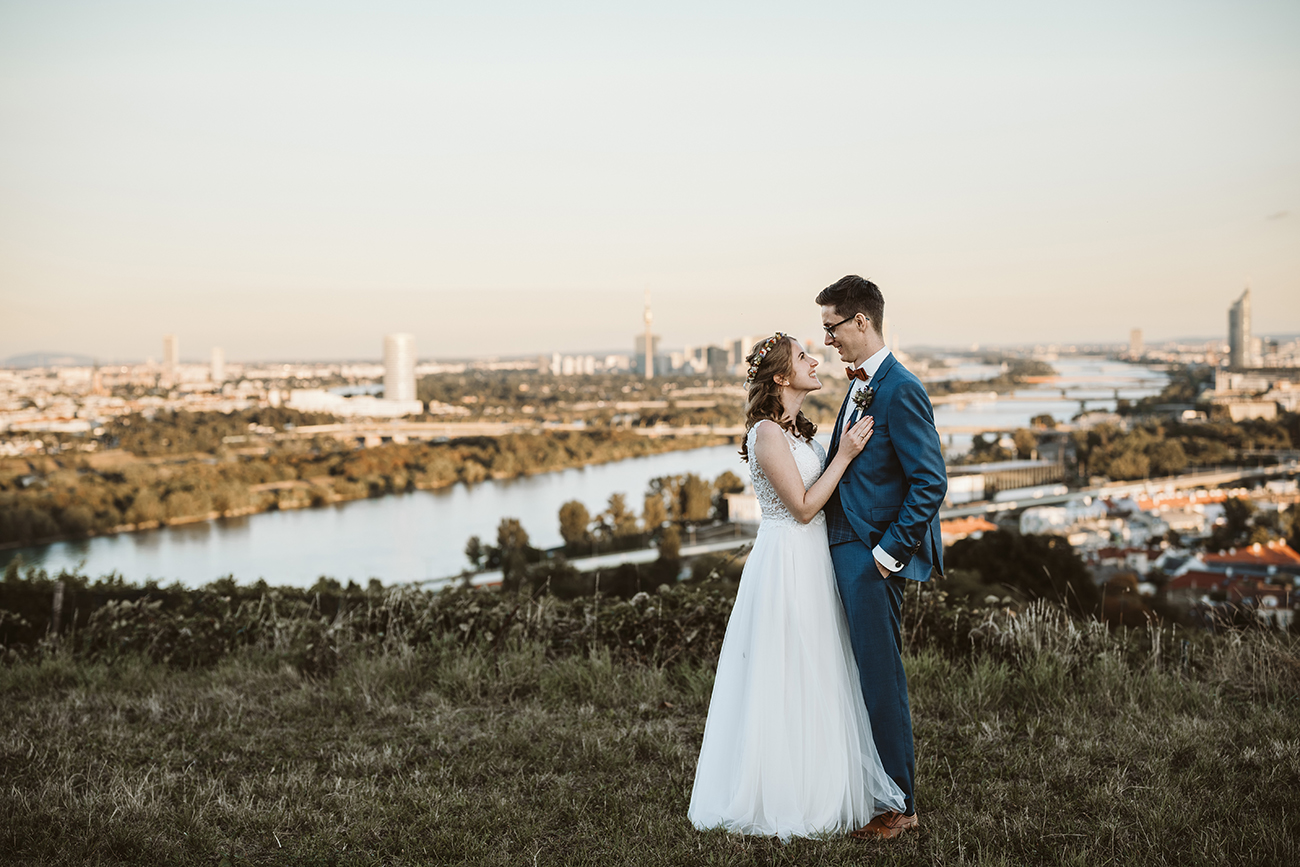 Beim Abendessen warteten typische Heurigen-Gerichte von Schnitzel bis Schweinsbraten. Nach dem Essen nutzten wir das weiche Abendlicht für ein kurzes Paarshooting in den umliegenden Weinbergen. Kein großes Posen, keine gestellten Szenen – einfach die beiden so, wie sie sind. Mit Blick über Wien und hinauf zum Kahlenberg entstanden echte, natürliche Aufnahmen.