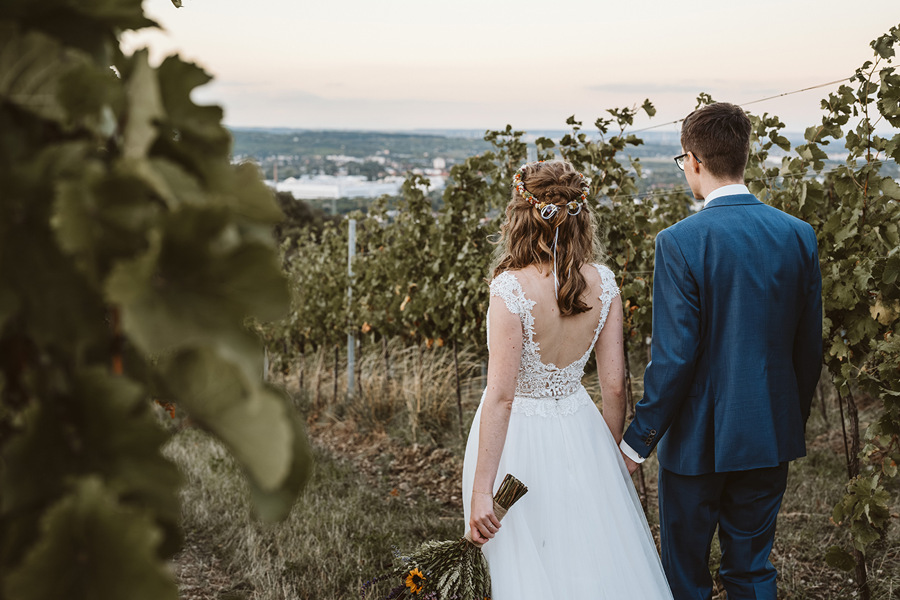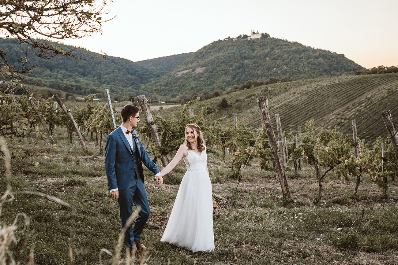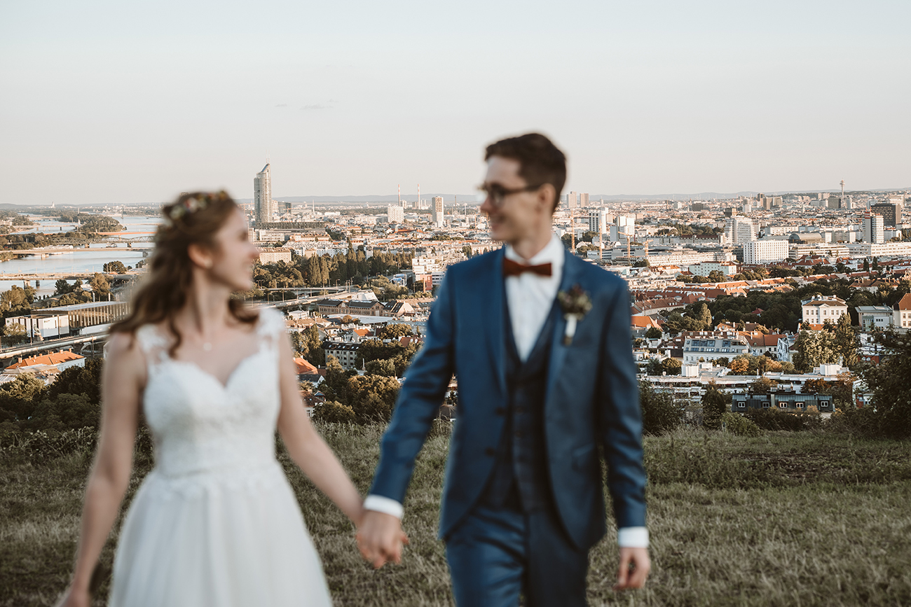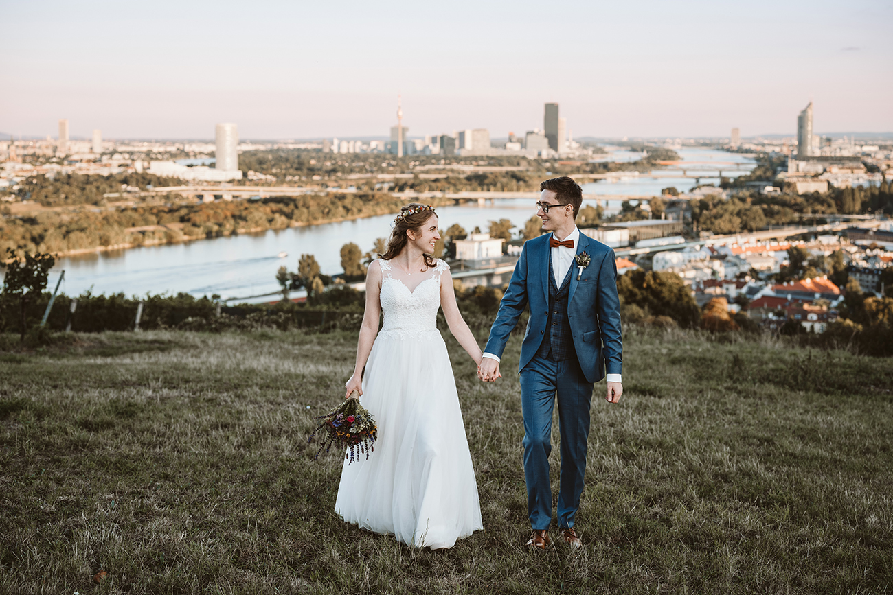 Beim Abendessen warteten typische Heurigen-Gerichte von Schnitzel bis Schweinsbraten. Nach dem Essen nutzten wir das weiche Abendlicht für ein kurzes Paarshooting in den umliegenden Weinbergen. Kein großes Posen, keine gestellten Szenen – einfach die beiden so, wie sie sind. Mit Blick über Wien und hinauf zum Kahlenberg entstanden echte, natürliche Aufnahmen.