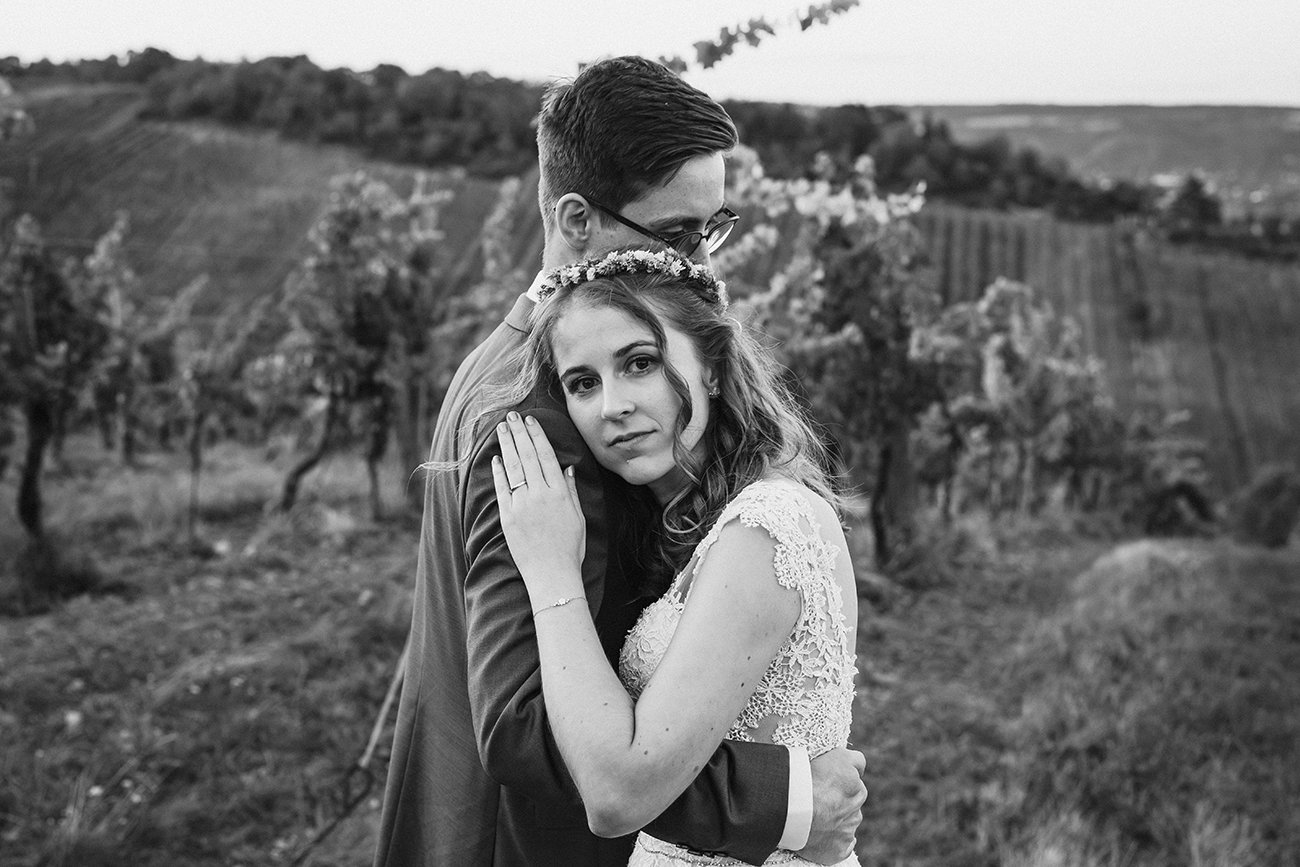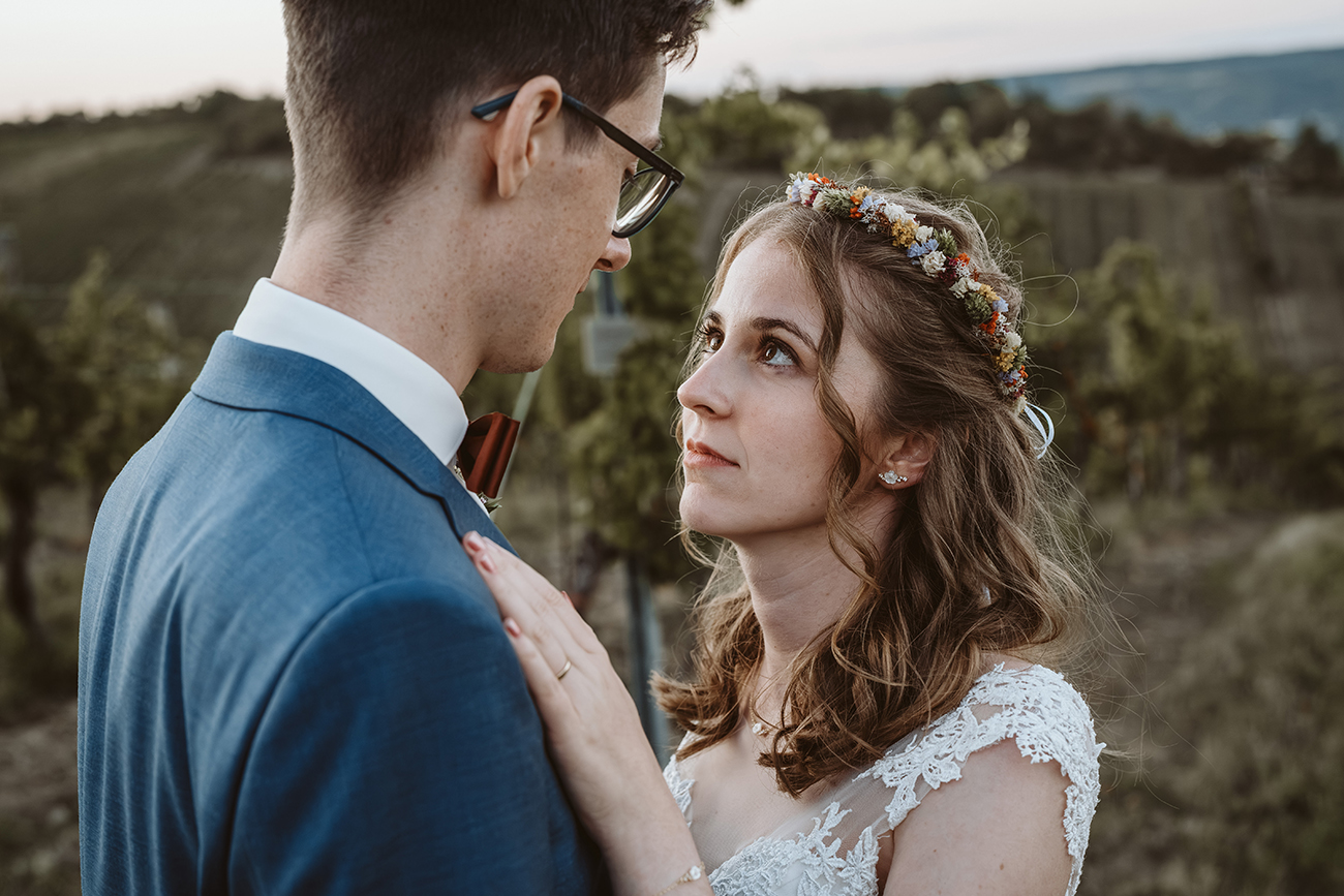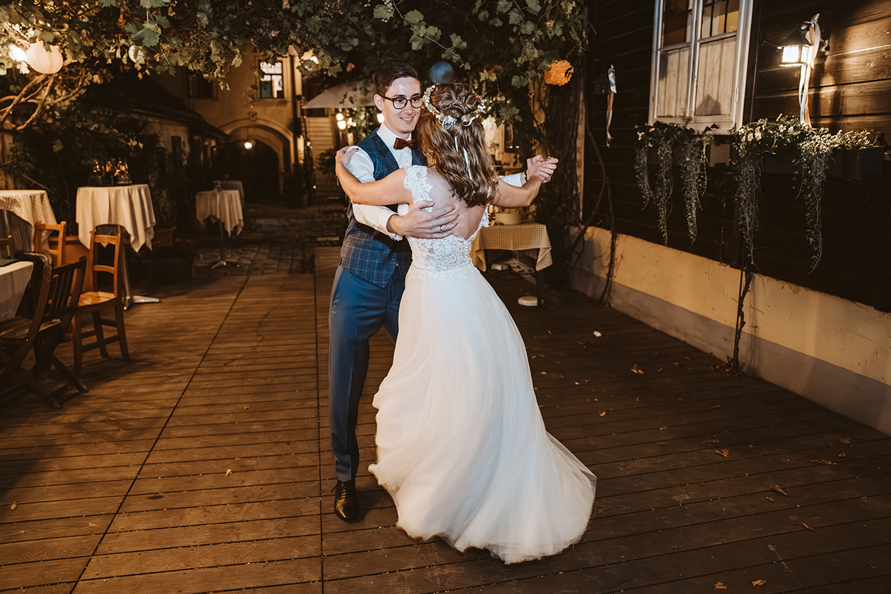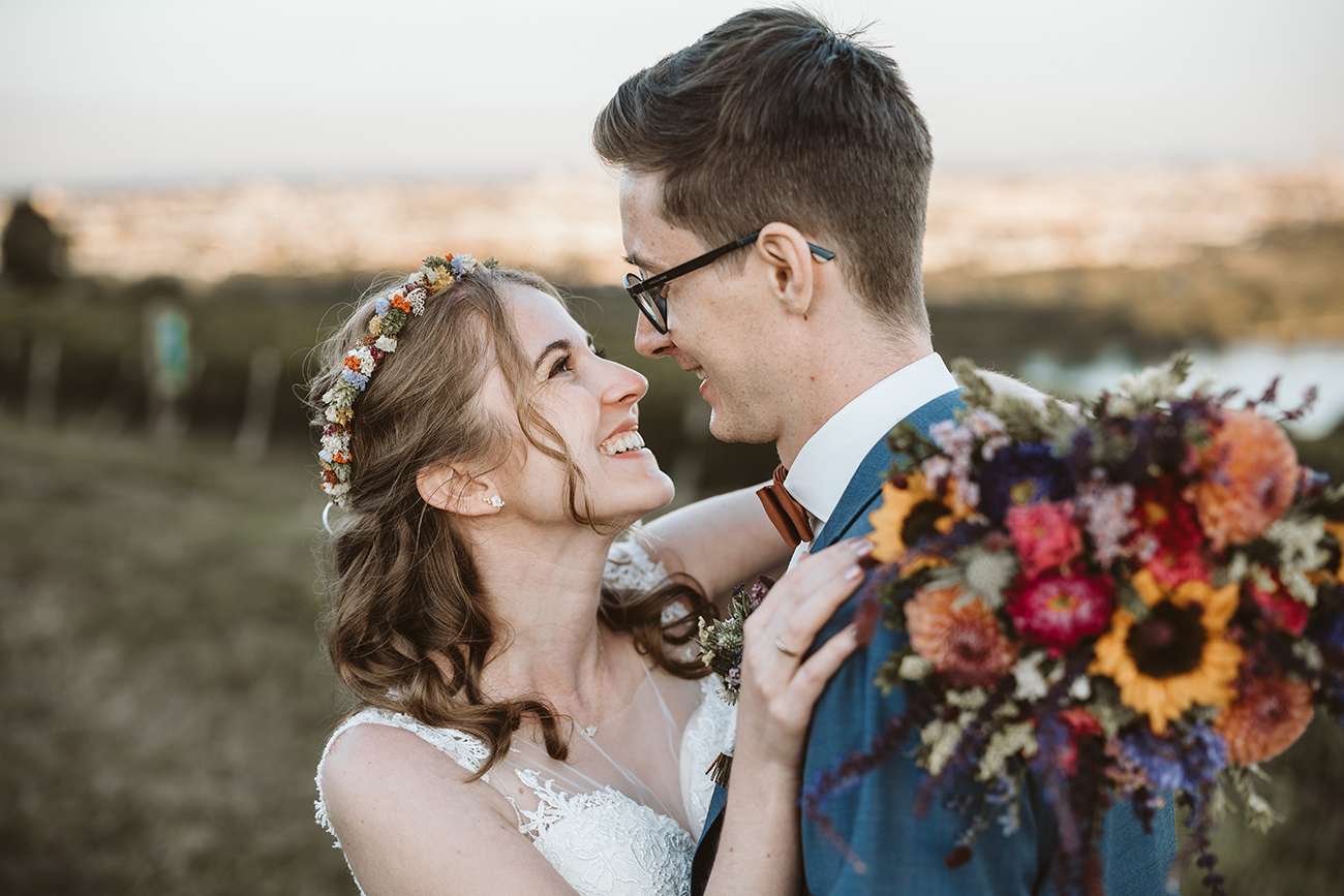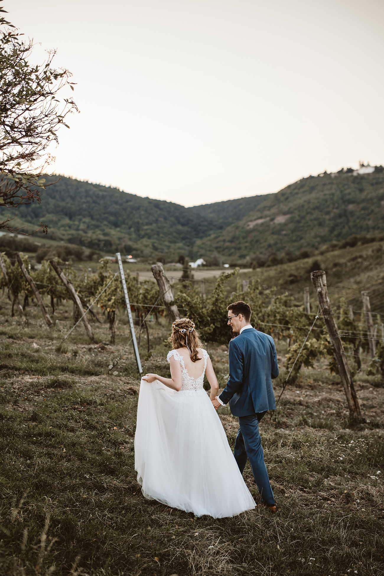 Beim Abendessen warteten typische Heurigen-Gerichte von Schnitzel bis Schweinsbraten. Nach dem Essen nutzten wir das weiche Abendlicht für ein kurzes Paarshooting in den umliegenden Weinbergen. Kein großes Posen, keine gestellten Szenen – einfach die beiden so, wie sie sind. Mit Blick über Wien und hinauf zum Kahlenberg entstanden echte, natürliche Aufnahmen.