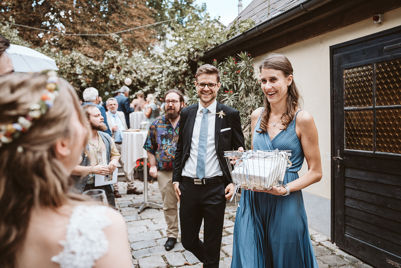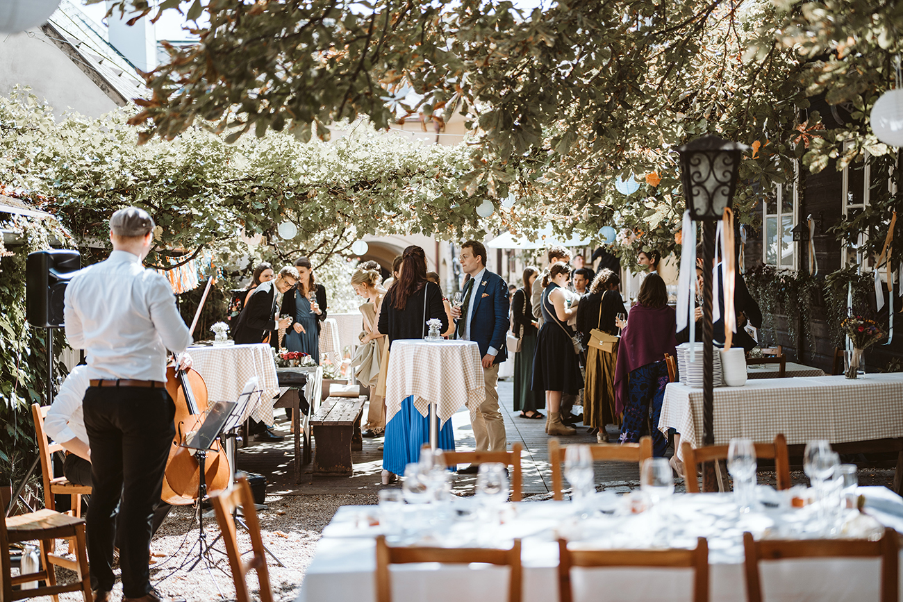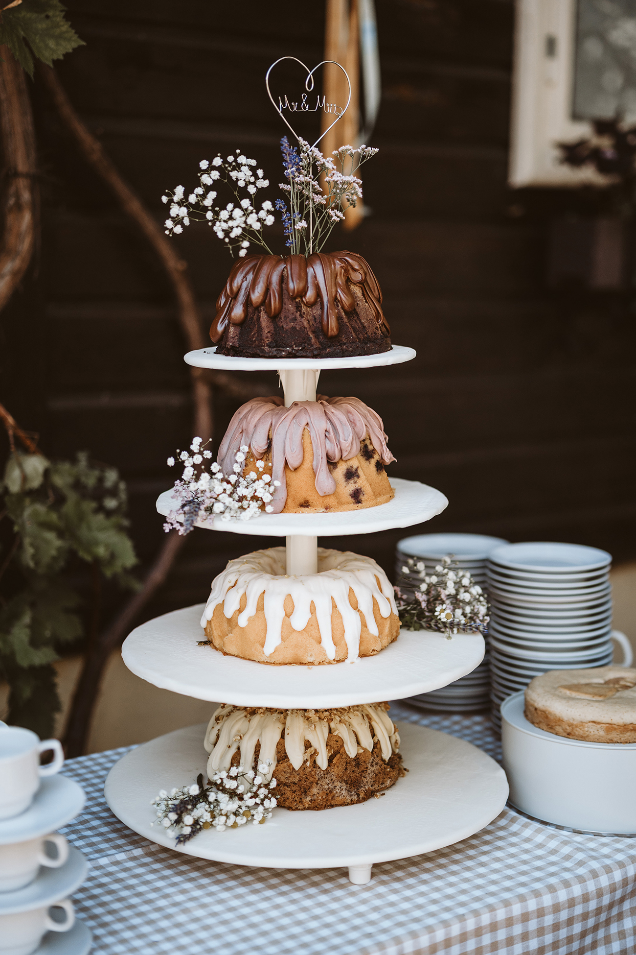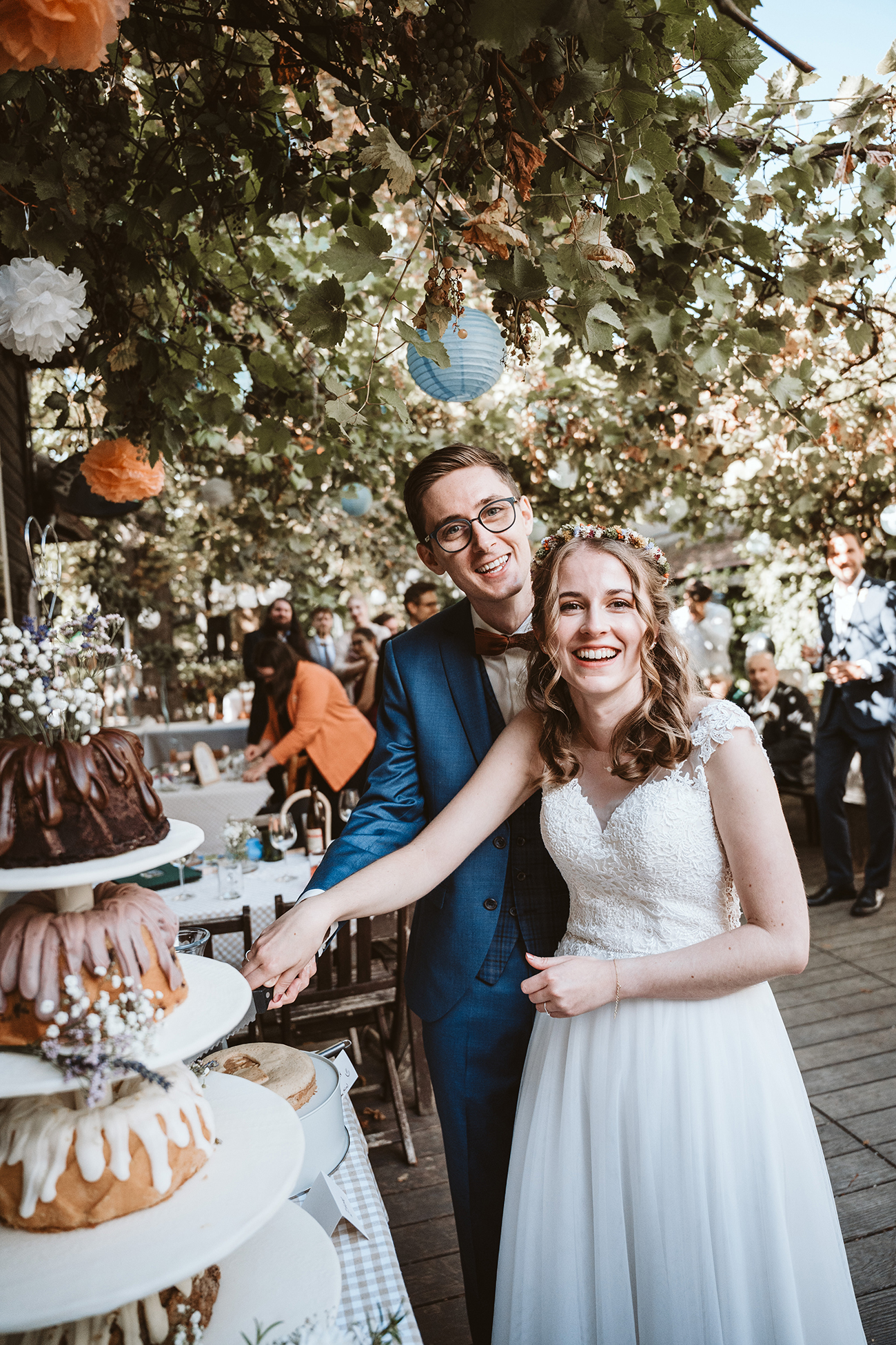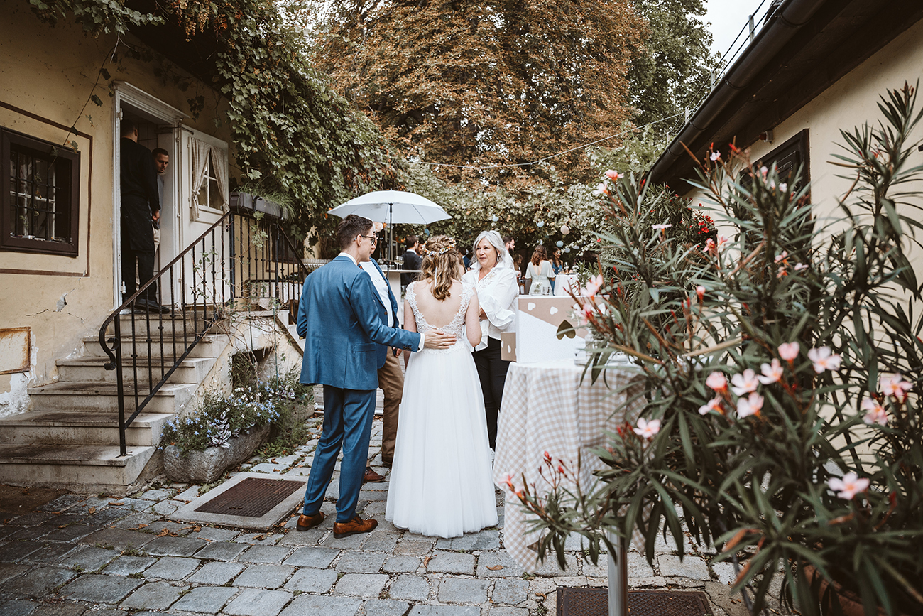 Nach der Zeremonie ging es weiter zum Heurigen Schübel-Auer in Nussdorf, einer gemütlichen Location, die perfekt zum lockeren Ablauf des Tages passte. Statt einer klassischen Hochzeitstorte gab es Hochzeitsgugelhupf – praktisch, unkompliziert und bei allen sofort beliebt.