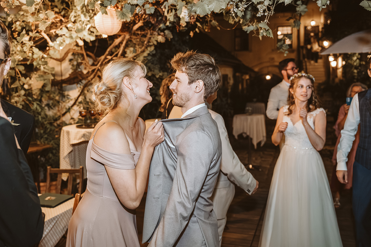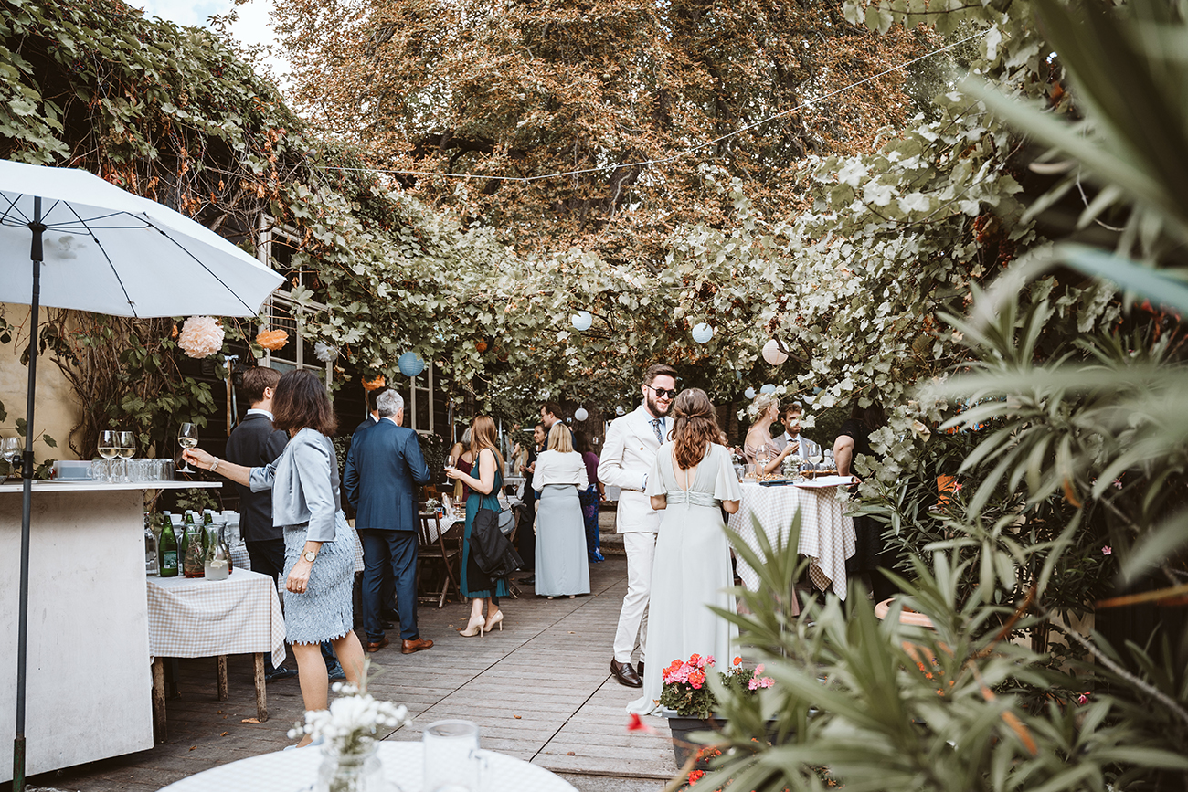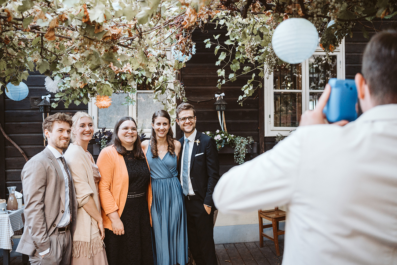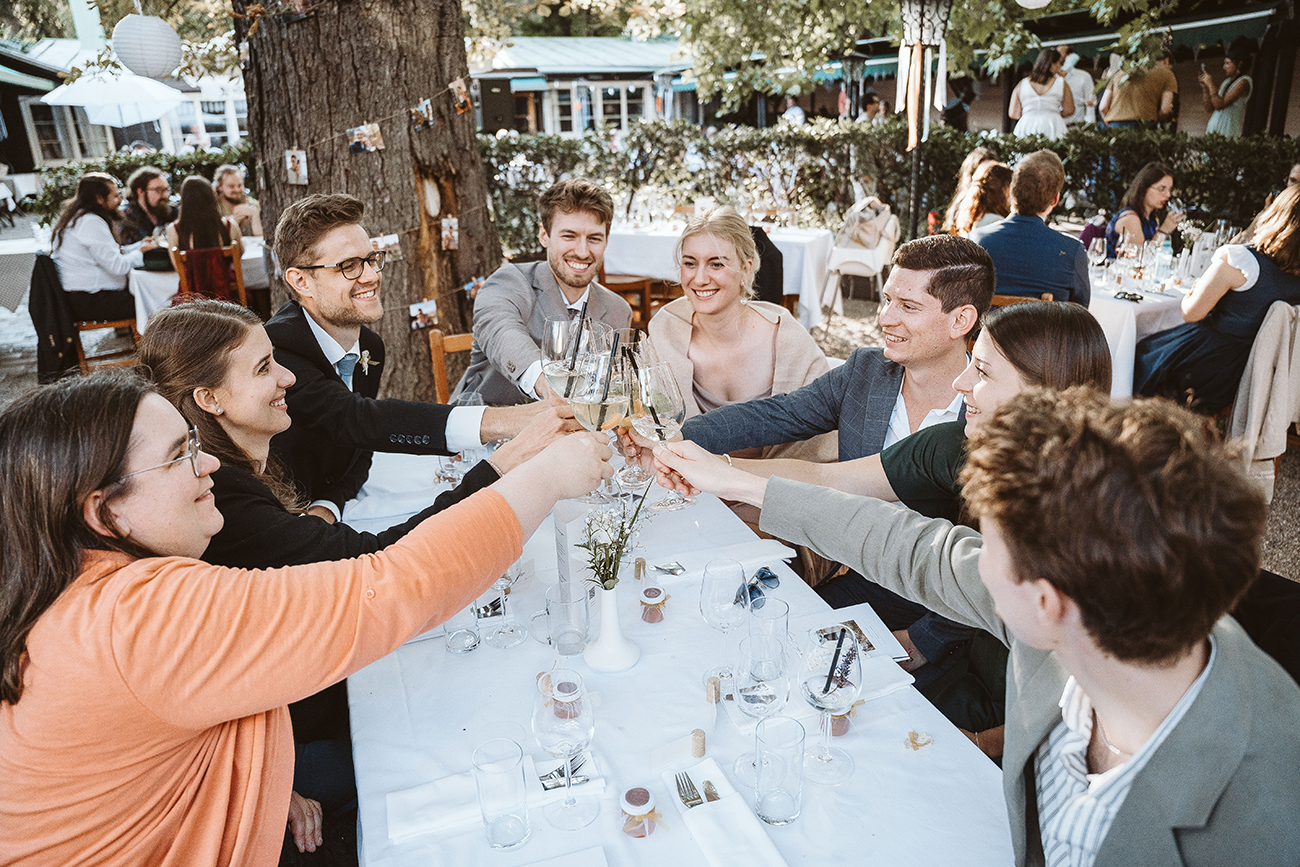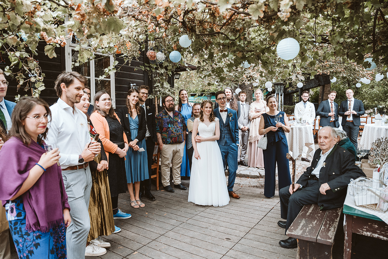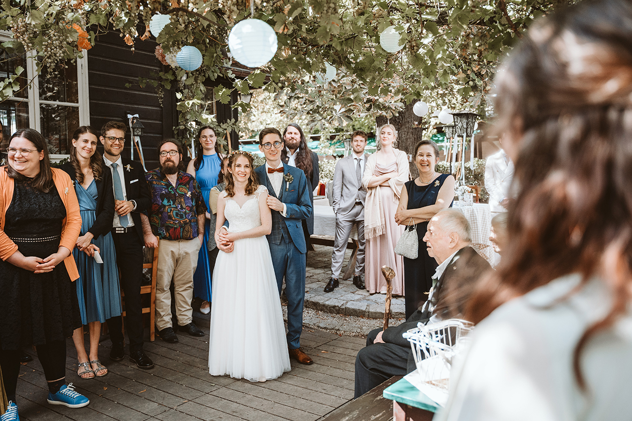 Nach der Zeremonie ging es weiter zum Heurigen Schübel-Auer in Nussdorf, einer gemütlichen Location, die perfekt zum lockeren Ablauf des Tages passte. Statt einer klassischen Hochzeitstorte gab es Hochzeitsgugelhupf – praktisch, unkompliziert und bei allen sofort beliebt.