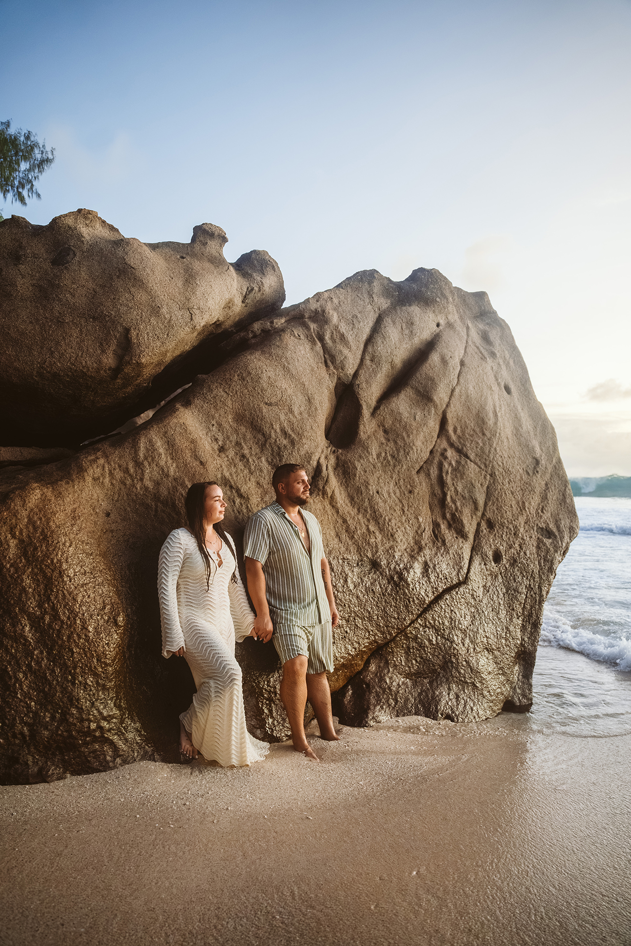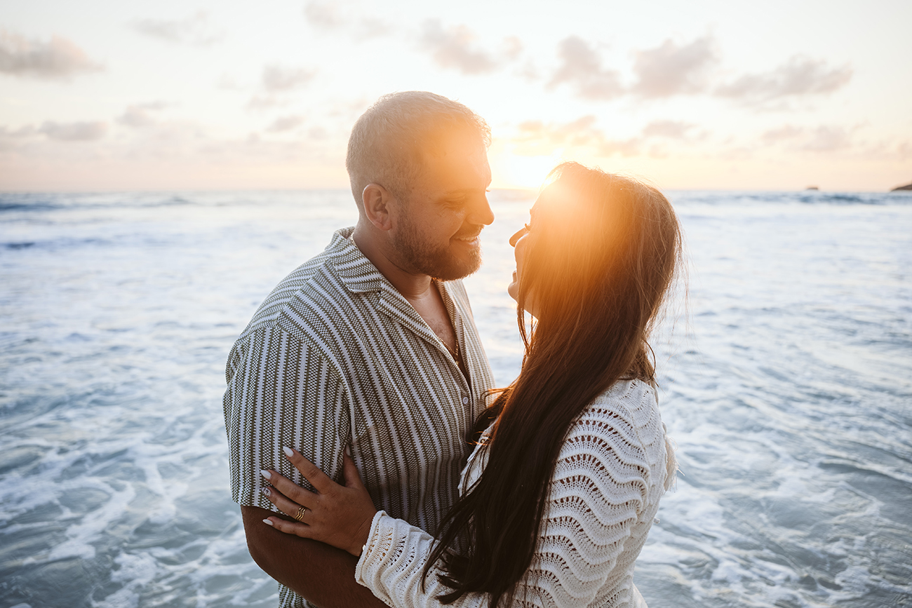 Wir nutzten die weichen Farben des Abends, den offenen Strand und die ruhige Brandung, um ganz natürliche und ungestellte Momente einzufangen. Die beiden waren von Anfang an völlig bei sich, was das Fotografieren einfach und angenehm machte.